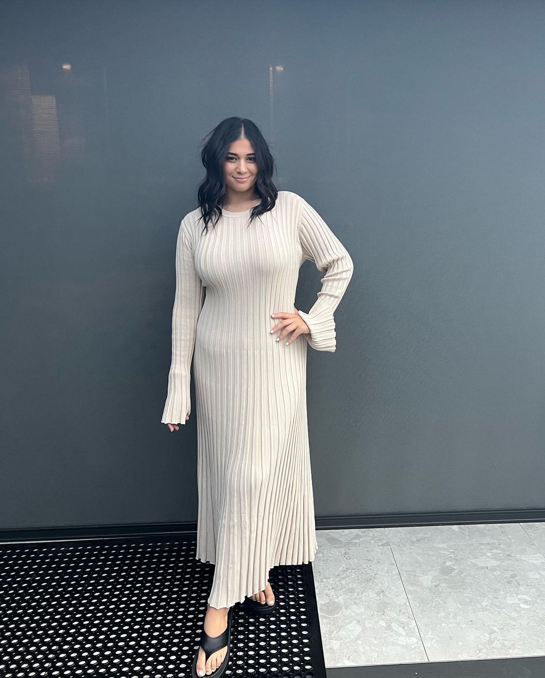 Autumn Winter Knitted Dress Casual Waist Tight Round Neck Big Pit Stripe Slimming Knitted Maxi Dress Women