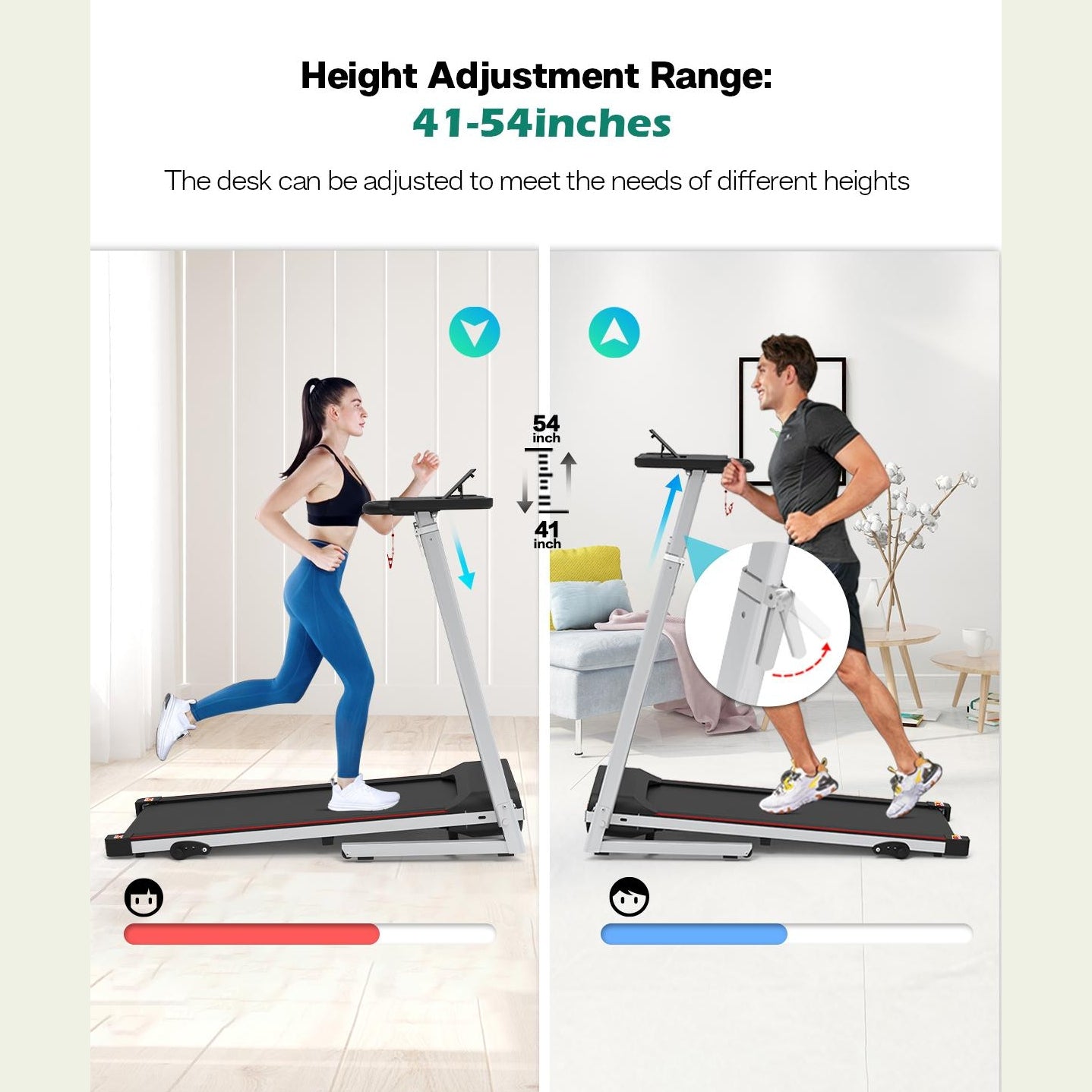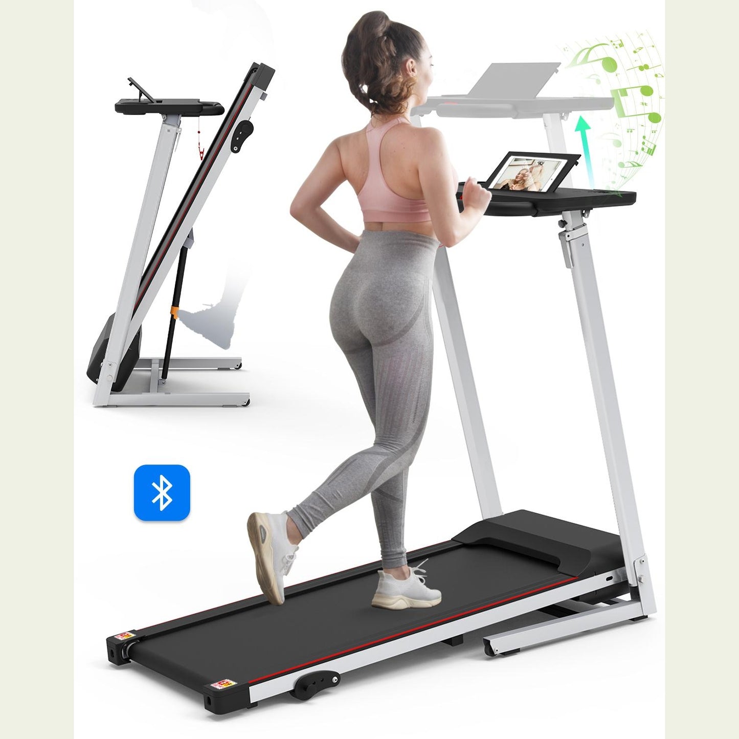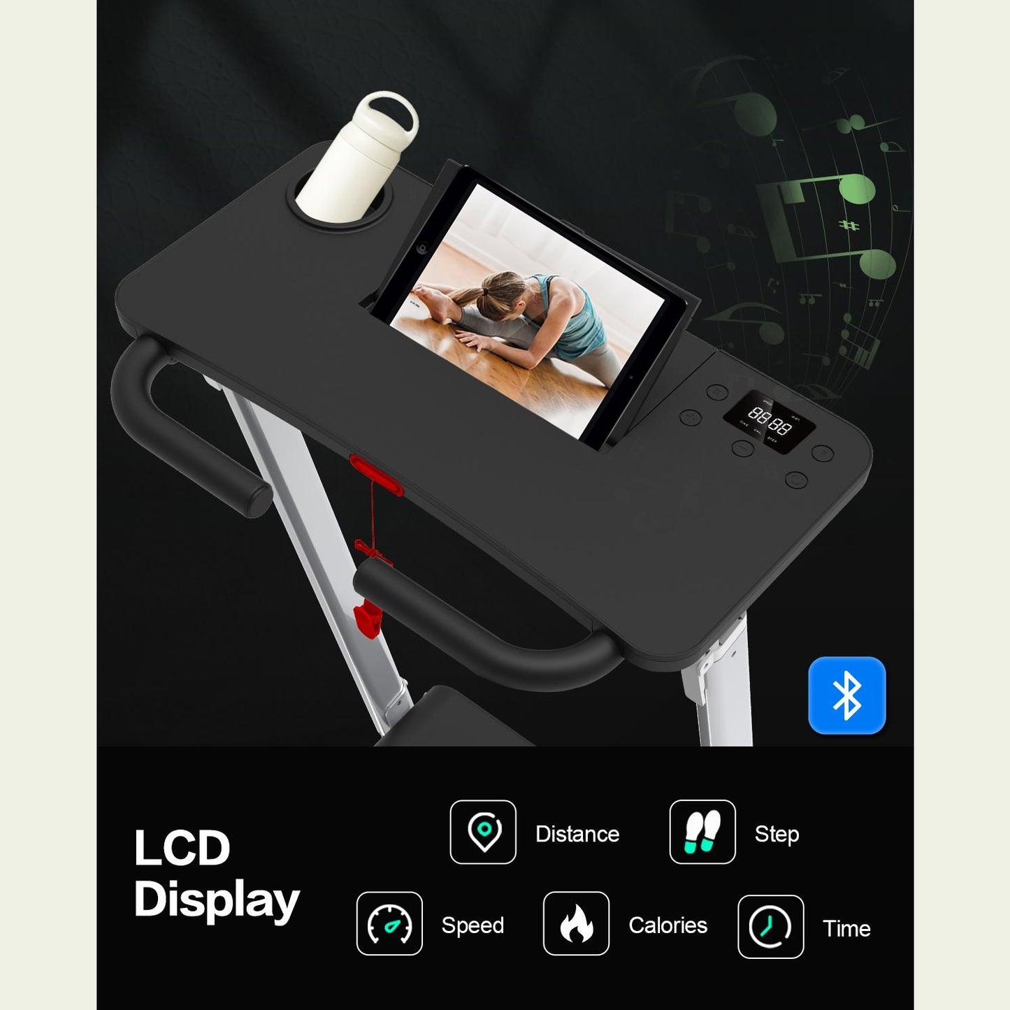 👍【Cinta de correr plegable con escritorio】La cinta de correr plegable tiene un escritorio grande en el que puedes colocar una computadora portátil, un bloc de notas, un libro y otros artículos; el tamaño del escritorio es de 25,2" (largo) x 11,8" (ancho). La pantalla LCD multifuncional incorporada rastrea tu rendimiento, incluido el tiempo, la velocidad, la distancia, las calorías y los pasos, lo que promete un entrenamiento en cinta de correr en casa superior y efectivo.