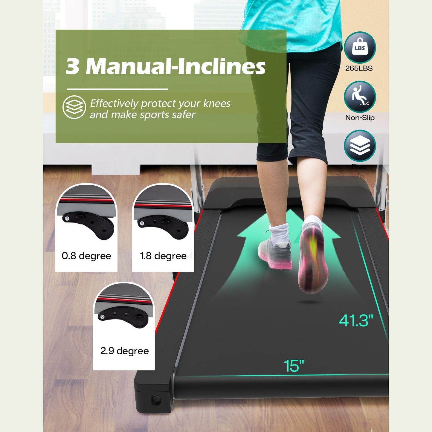 👍【3 niveles de inclinación ajustables y cinta de correr duradera】La cinta de correr de goma de gran superficie de 15” x 41,3” de la cinta de correr ofrece un espacio cómodo para hacer ejercicio y una experiencia de ejercicio más estable. La inclinación de esta cinta de correr motorizada se puede ajustar manualmente a 3 niveles, lo que puede reducir el daño a la articulación de la rodilla y consumir más calorías durante el ejercicio.