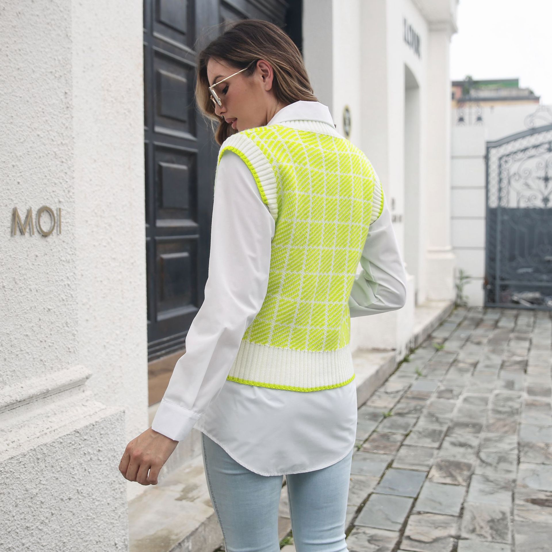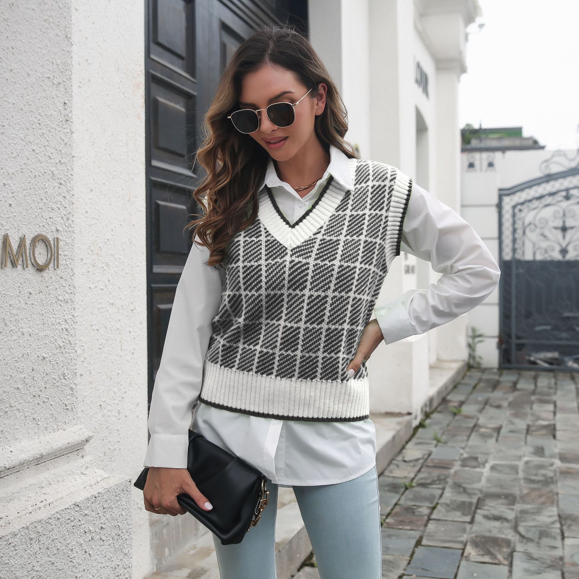 Plaid V-neck Vest Sweater Women Vest Outer Wear Inner Wear Autumn Winter Striped Knitwear Sweater