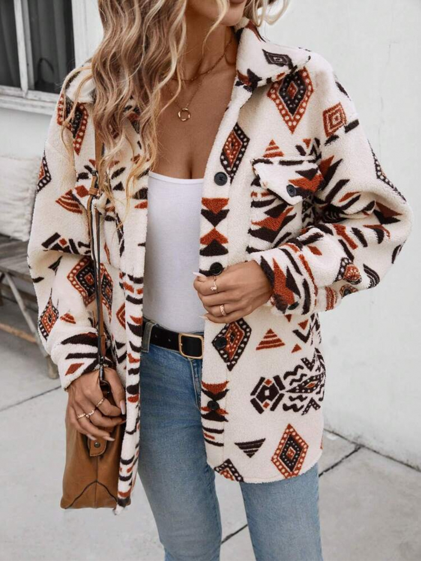 Popular Plush Collared Casual Cardigan Patch Pocket Button Coat Women