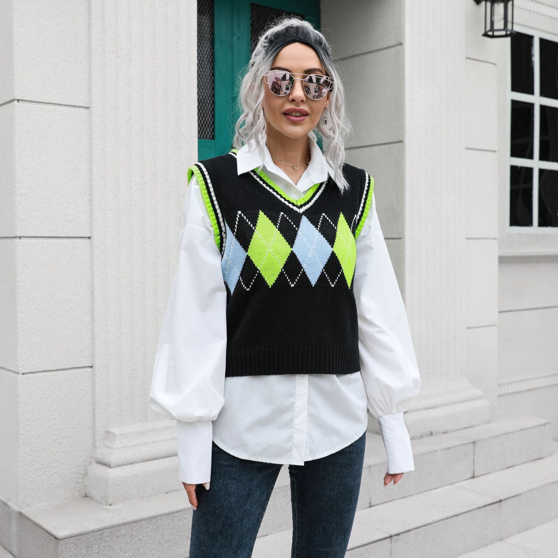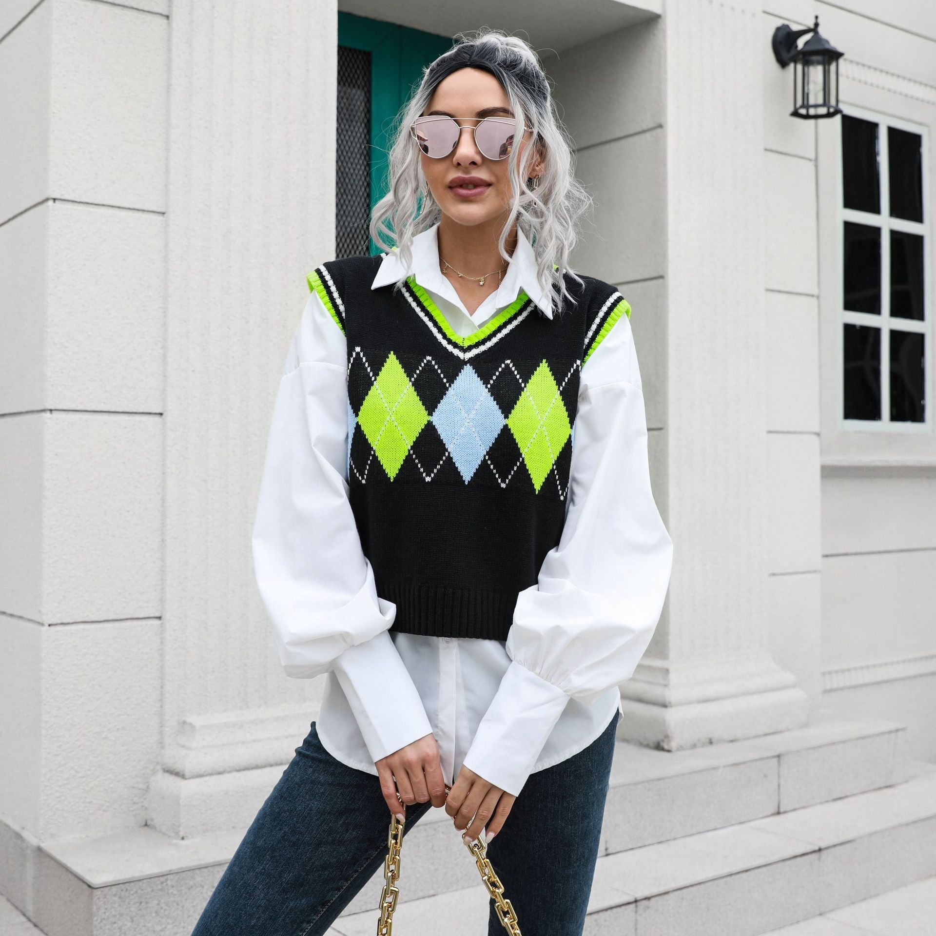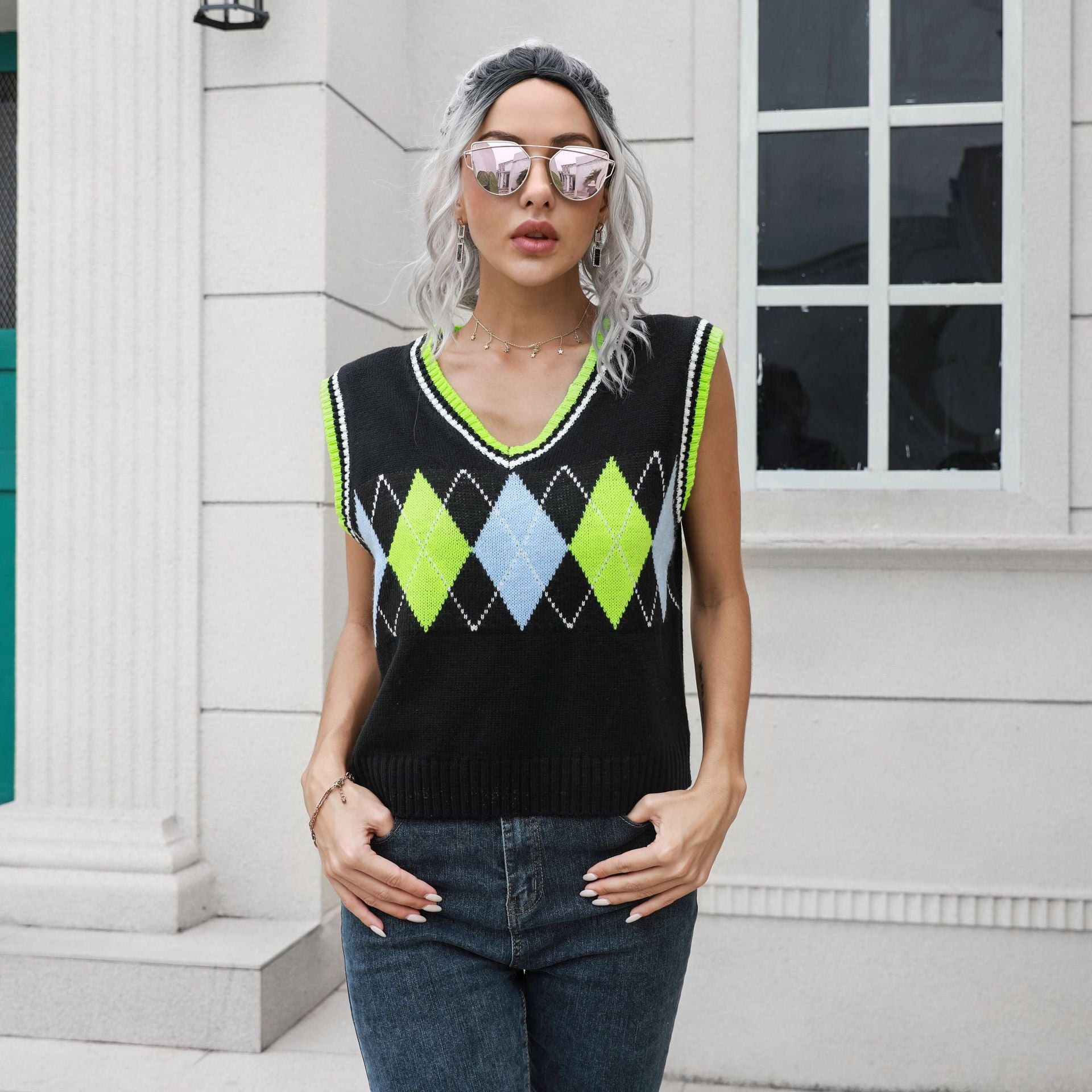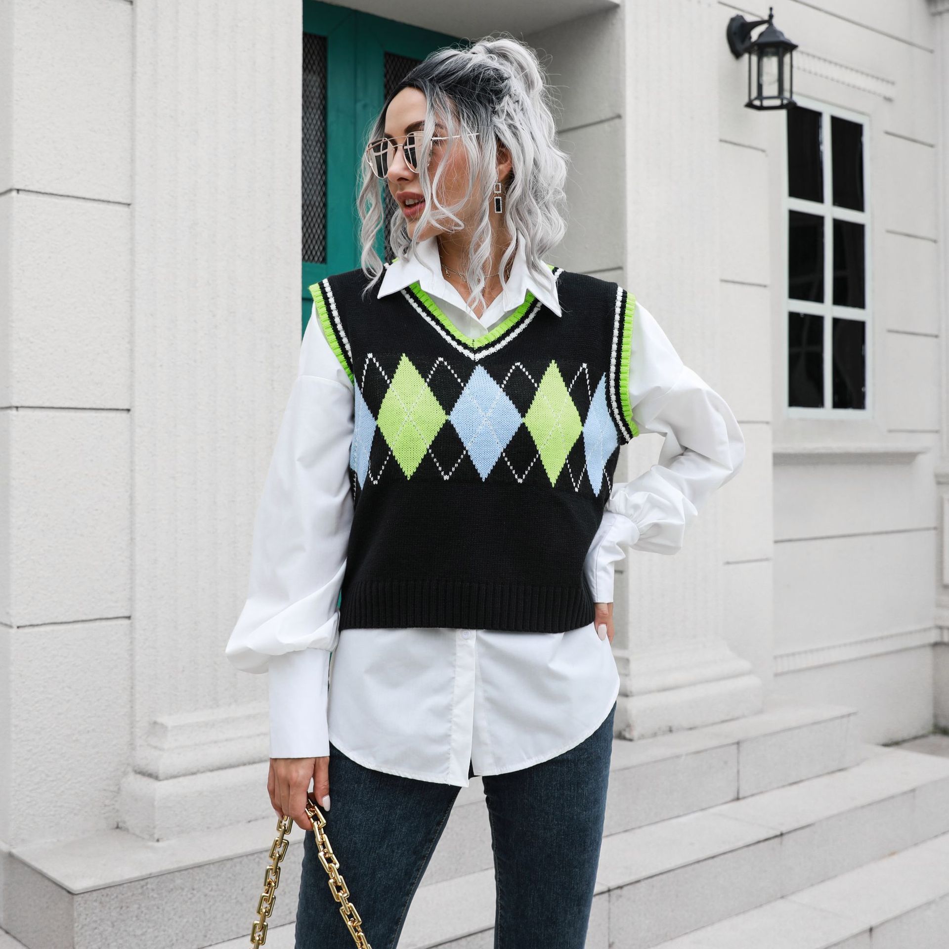 Rhombus V-neck Plaid Vest Sweater Women Vest Outer Wear Inner Wear Autumn Winter Knitwear Sweater