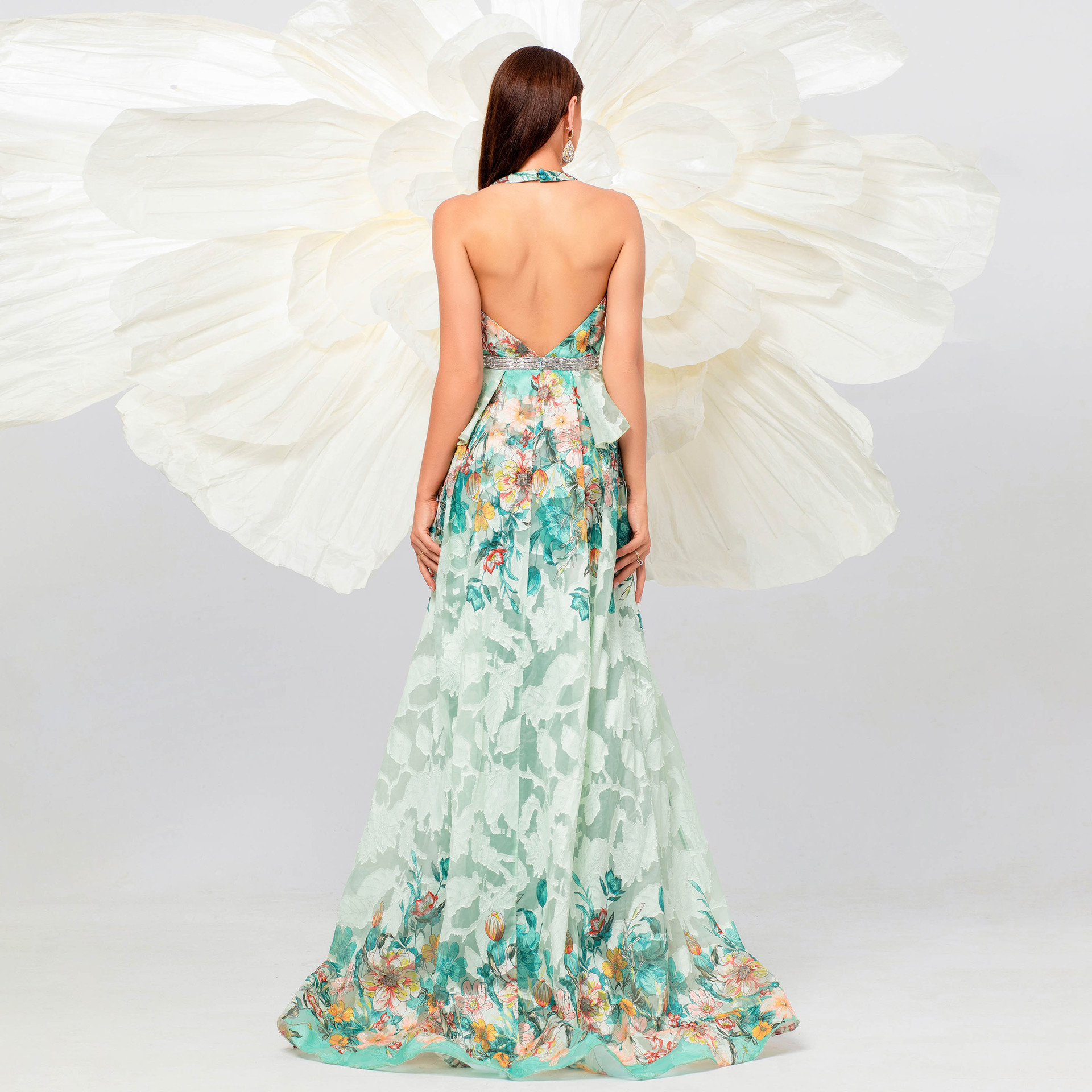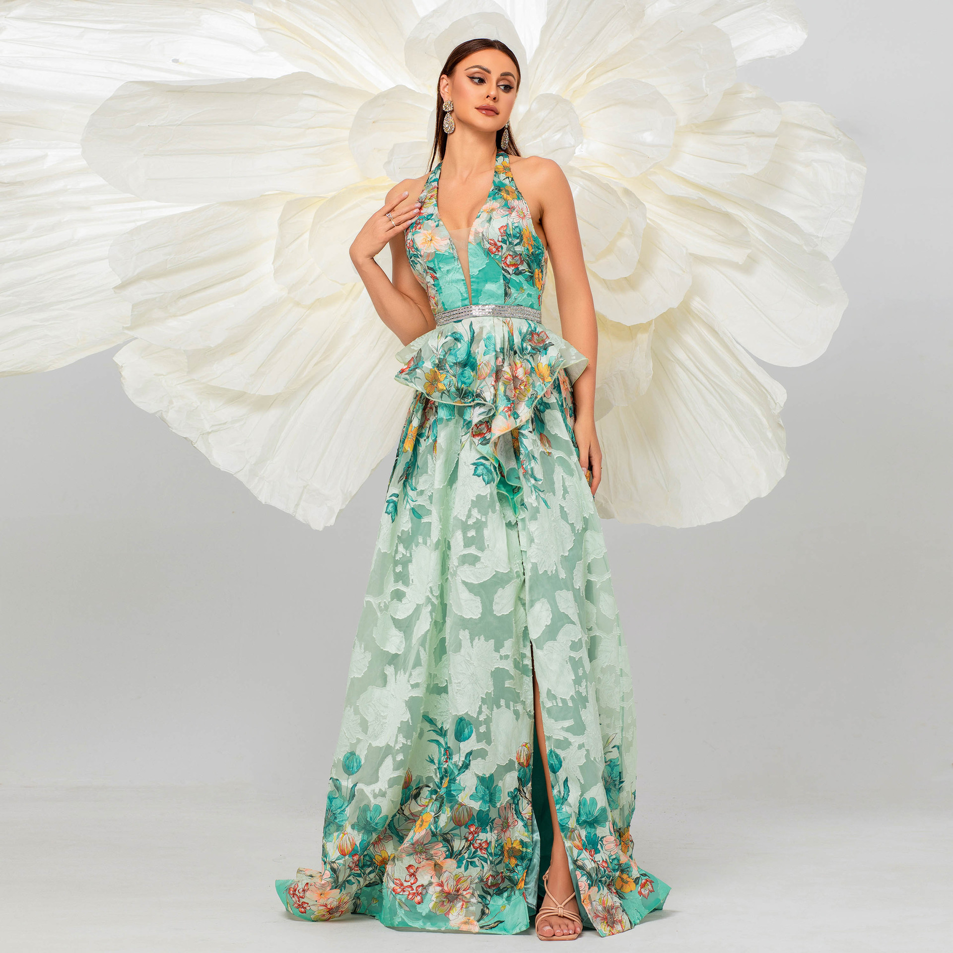 Sleeveless V neck Halter Long Floor Length Wedding Evening Dress Large Swing Dress Women Clothing