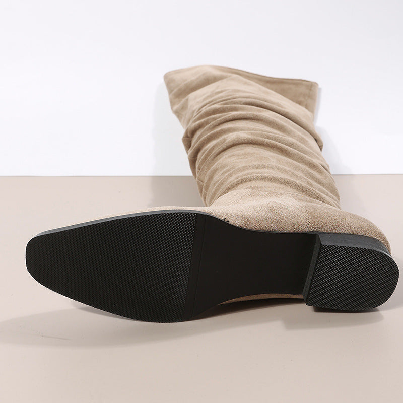 Square Heel Pointed Toe Mid Calf Length Knight Boots Women Suede Pleated Pile Sleeve Pointed Boots