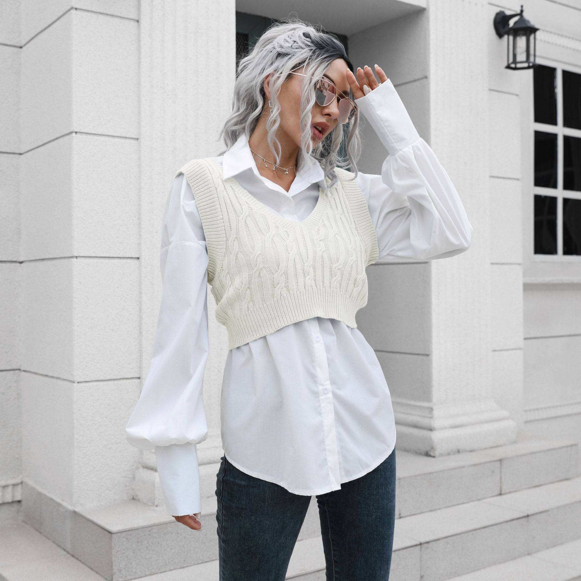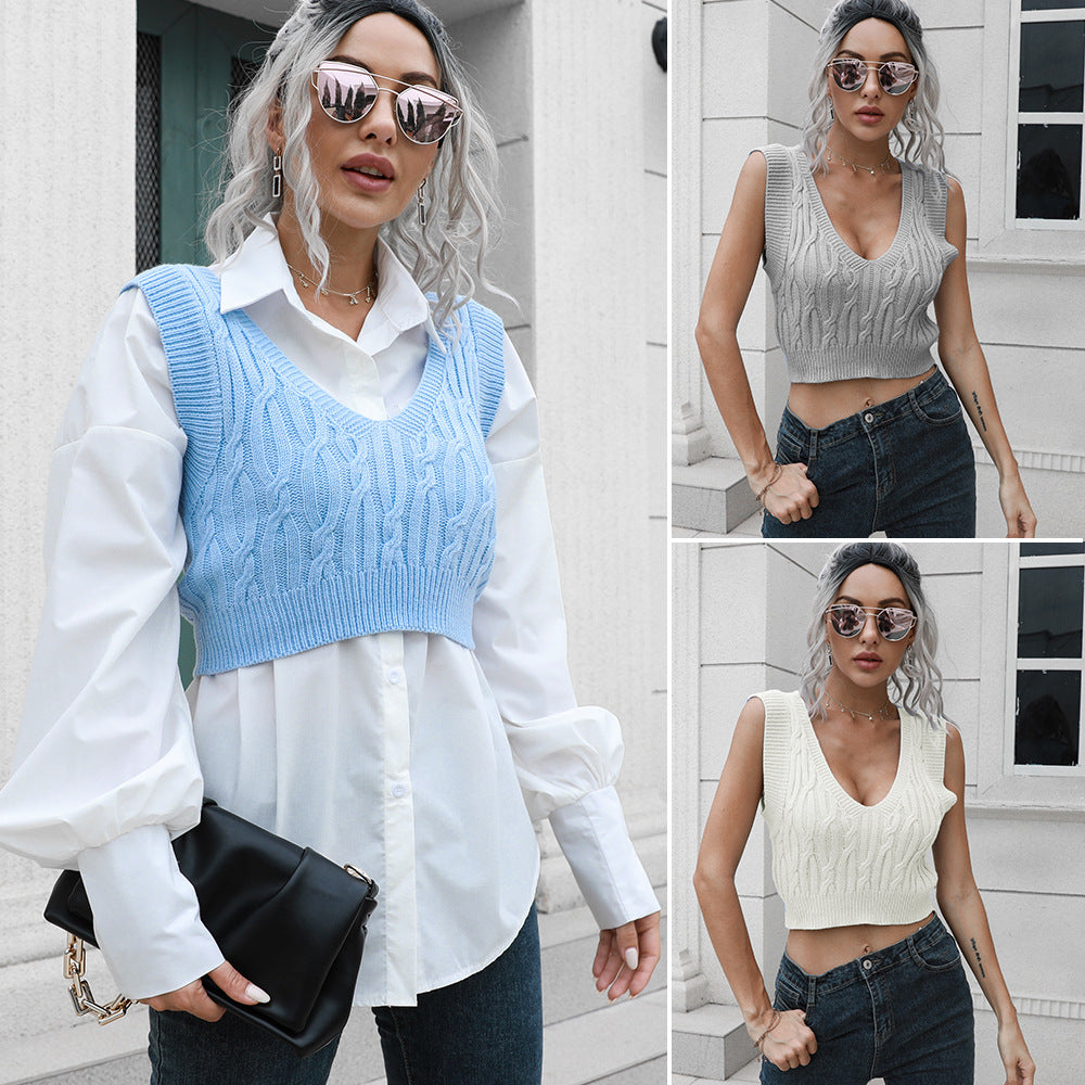 Twist V-neck Short Vest Sweater Women Short Vest Autumn Winter Outer Wear Inner Wear Knitwear Sweater