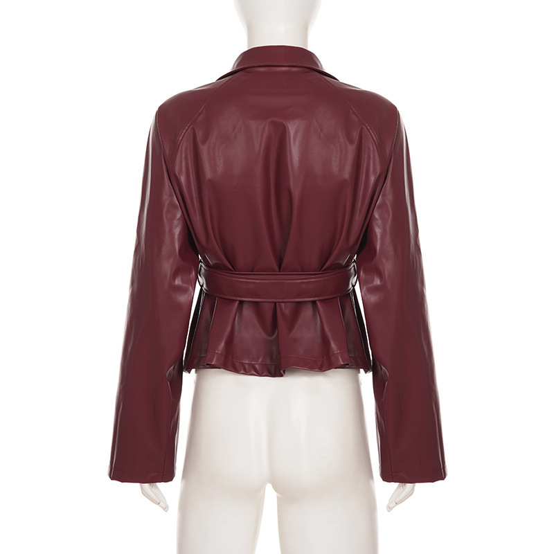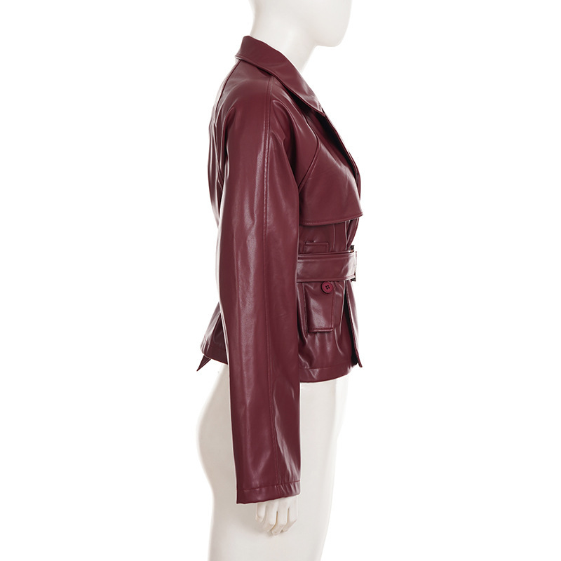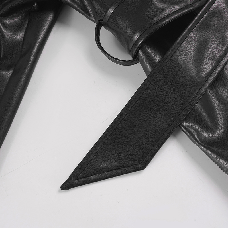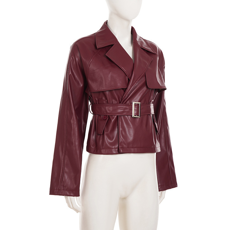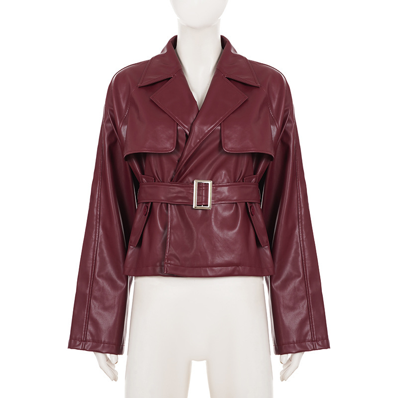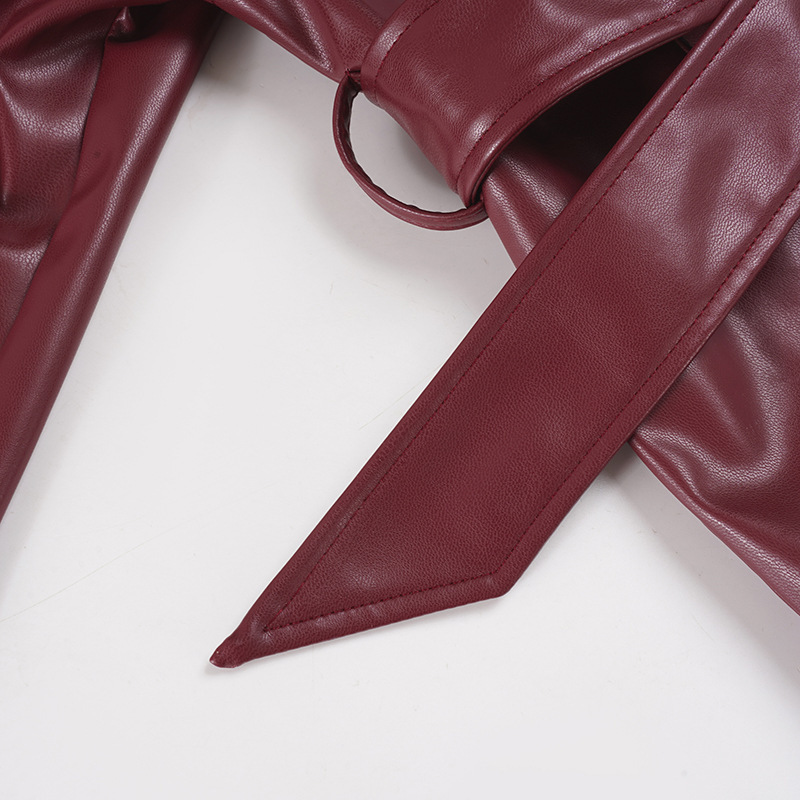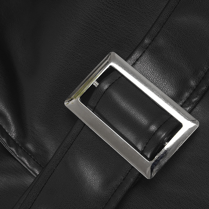Women Clothing Japanese Buckle Belt Leather Coat Solid Color Windbreaker Sexy Long Sleeved Top Autumn Winter Outer Tower