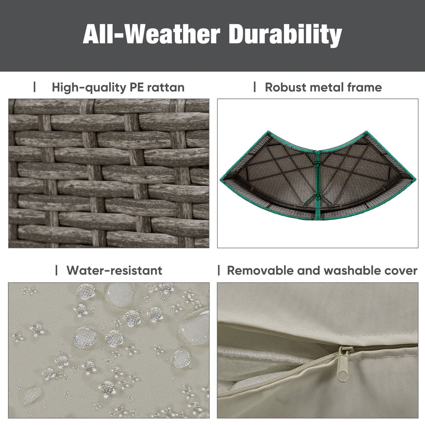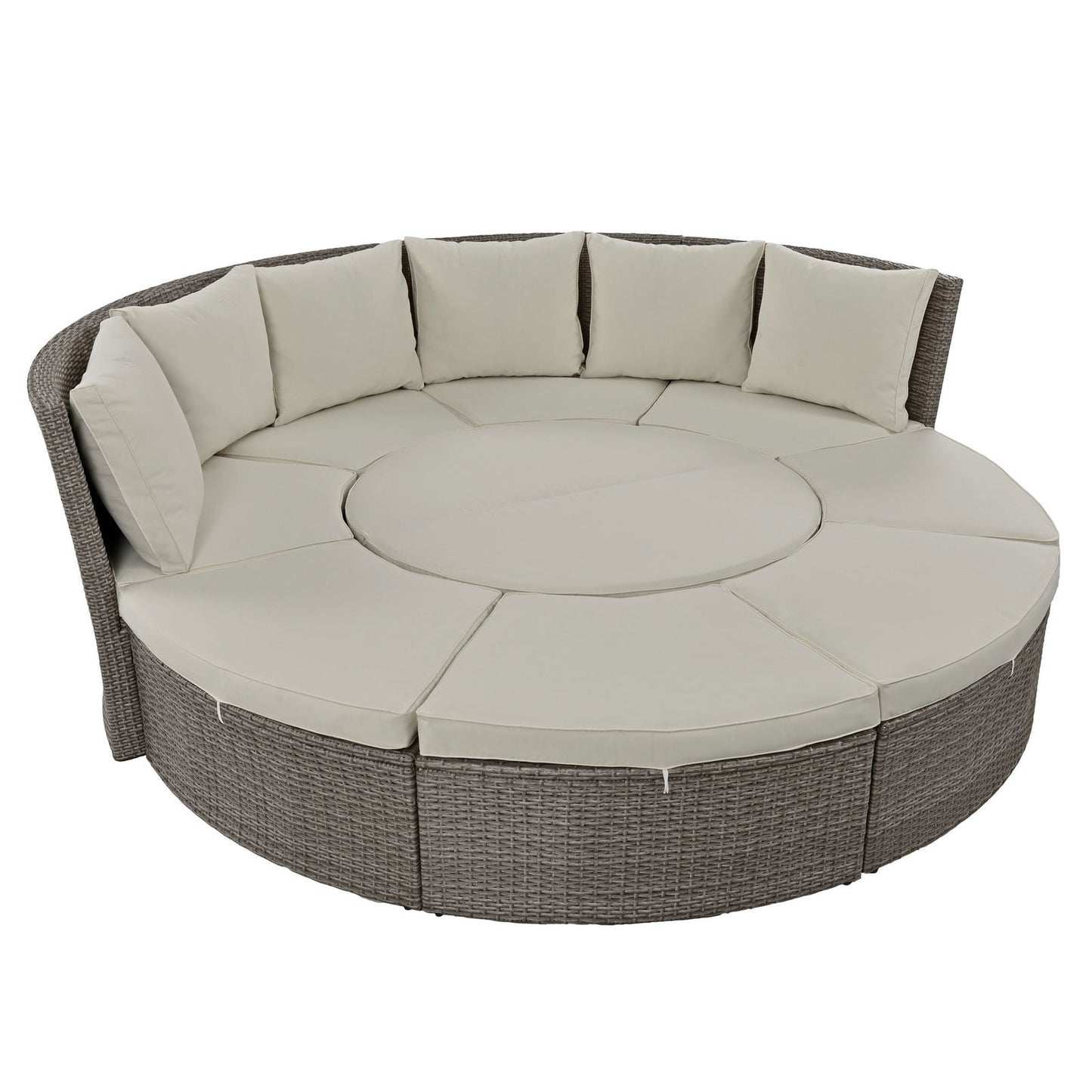 | Highlights | All-Weather PE Rattan // Metal Frame // 4 Loveseats // Round Liftable Table // Wood Tabletop // Multi-functional Table // Free Combination // Can Be A Sunbed // Washable Cushions&Pillows Cover // 15 Cushions&Pillows // Fixable Cushions // Adjustable Feet // 2 Colors Available |