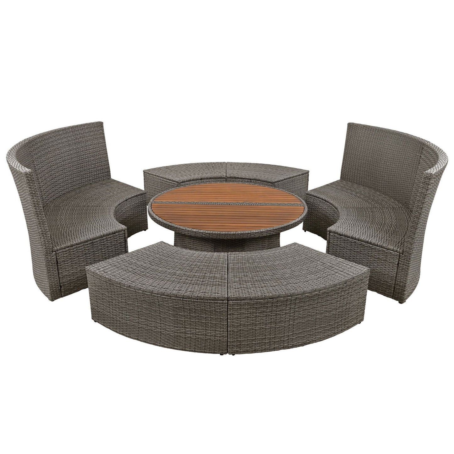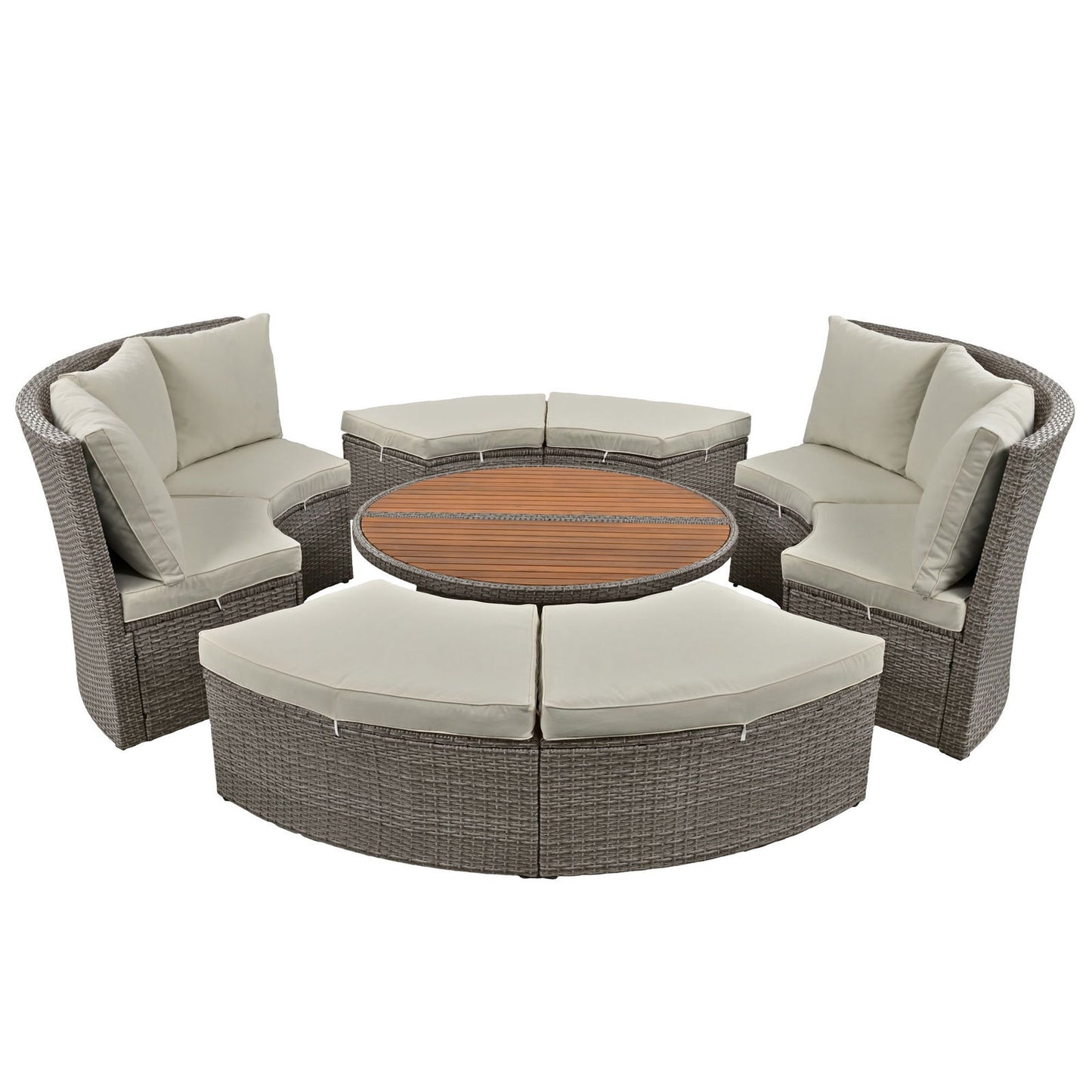 | Summary | Experience the ultimate in outdoor relaxation with our 5-piece all-weather PE rattan sofa set. Featuring a sturdy metal frame and four cozy loveseats, this set is perfect for any outdoor space. The centerpiece is a unique, round, liftable table with a stylish wood tabletop, offering multifunctional use and flexibility. Enjoy the ease of free combination to suit your space and style. The set includes 9 cushions with fixable buttons for added comfort and 6 pillows. All of them are with washable covers for your convenience. Adjustable feet ensure stability on any surface. Available in 2 colors to match your outdoor decor. |