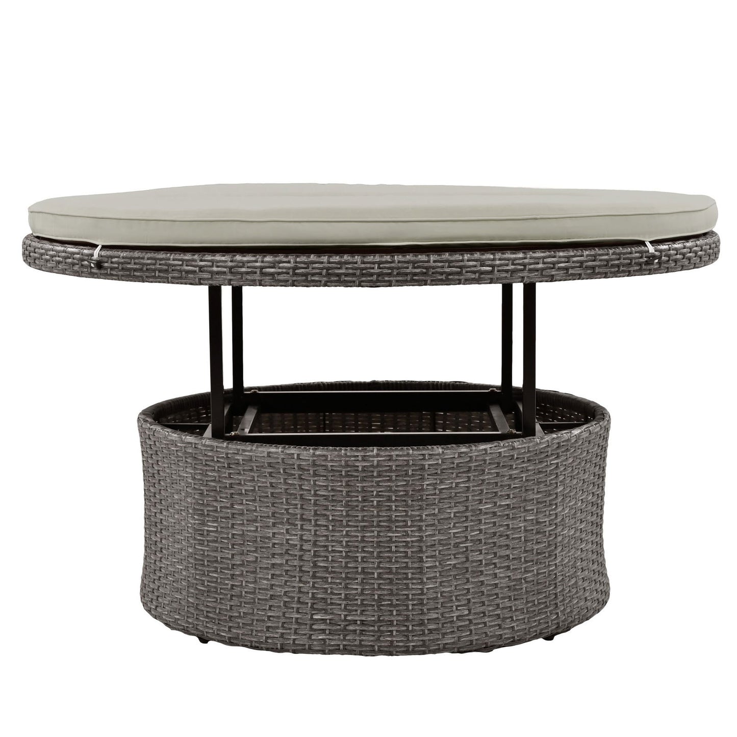 The centerpiece of this rattan sofa set is a round, liftable table with a wooden tabletop that doubles as an extra seating option thanks to its included cushion. This multi-functional table can be lifted to suit your needs.