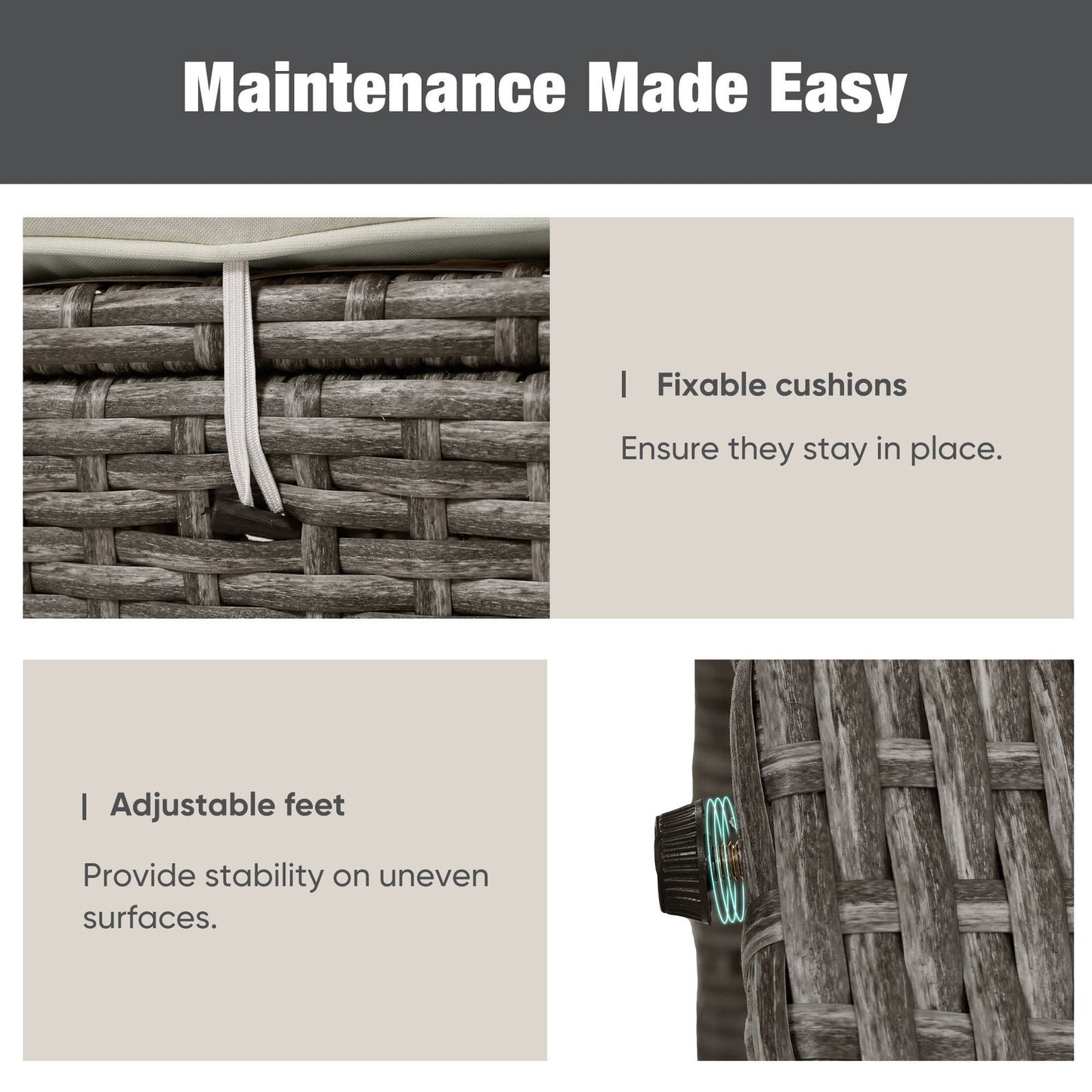 - [Maintenance Made Easy] Keeping your outdoor furniture in pristine condition is effortless with washable cushion and pillow covers. The fixable cushions ensure they stay in place, even on windy days, while the adjustable feet provide stability on uneven surfaces. This thoughtful design means you can enjoy your outdoor oasis without the hassle of constant upkeep.