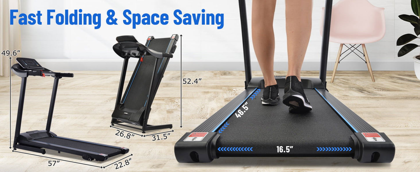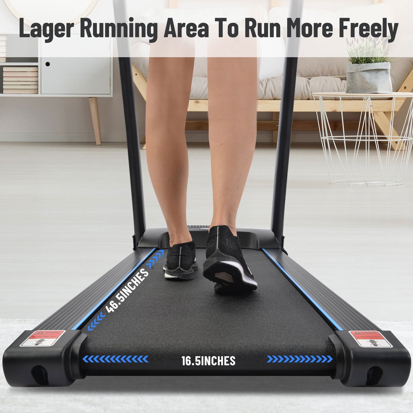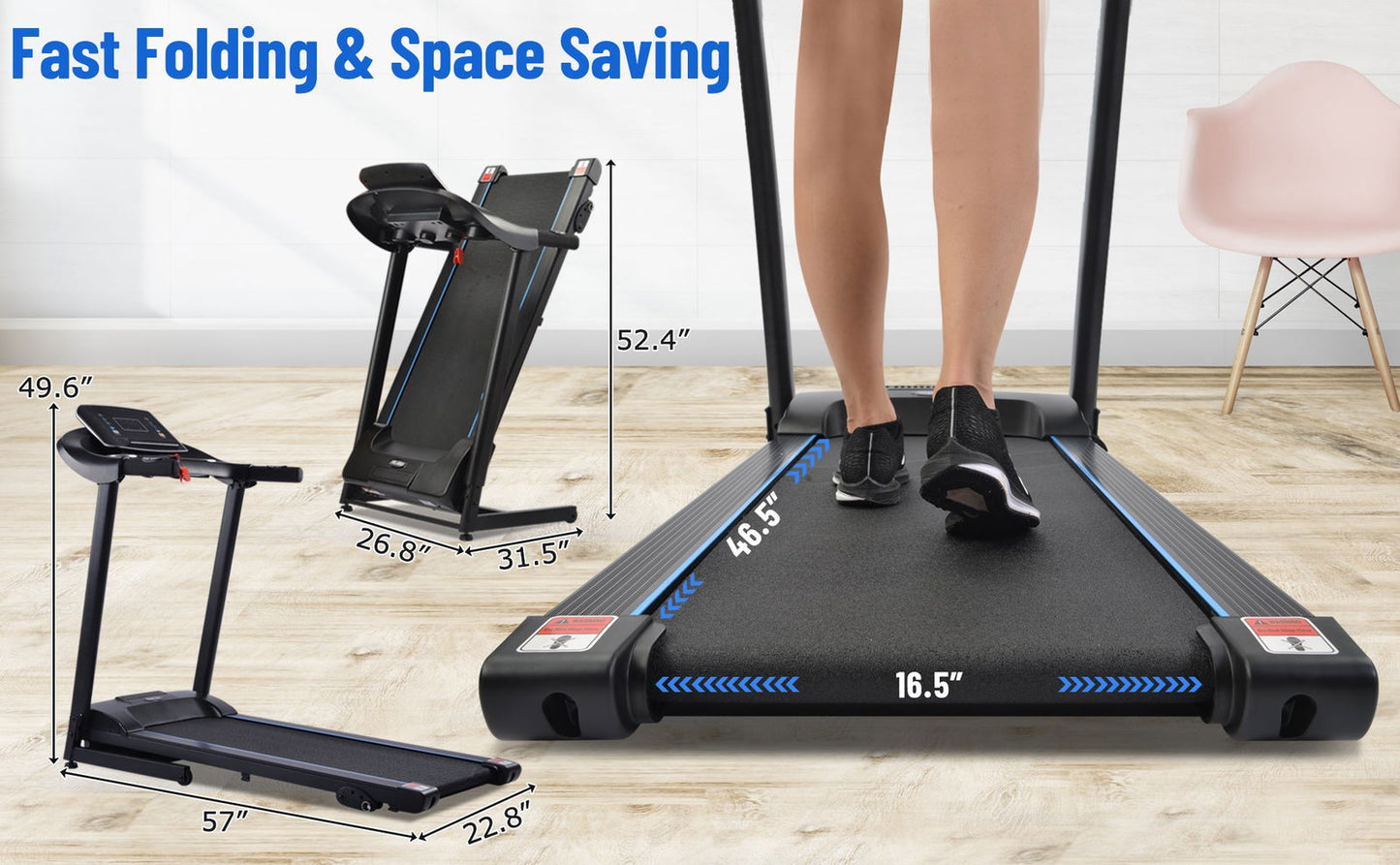 Spacious 46.5 x 16.5 tread belt gives you plenty of room for elbow and feet to get moving. Meanwhile, you dont have to sacrifice your living space to get a great workout with the folding design. You can easily fold the treadmill up and roll it out of the way for storage.