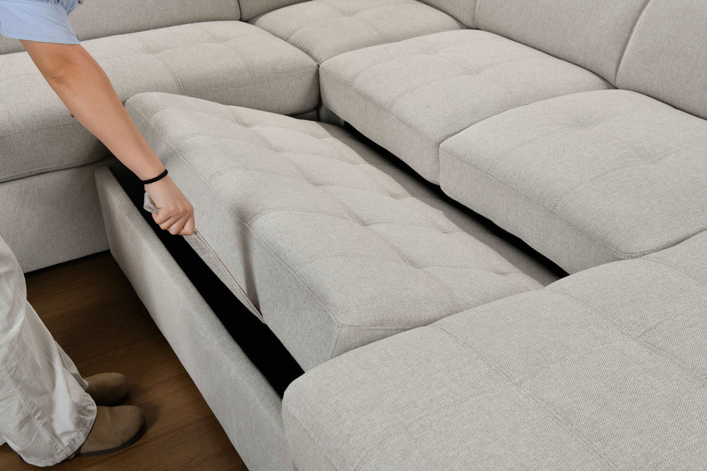 - [Comfortable sectional sofa with storage chaise]: The upholstered backrest and the springs offer great support for you to relax comfortable. The upholstered storage chaise offer convenient space for putting small items like your blankets, magazines, pillows, Belfast Fabric, well save your space and keep the living room clean.