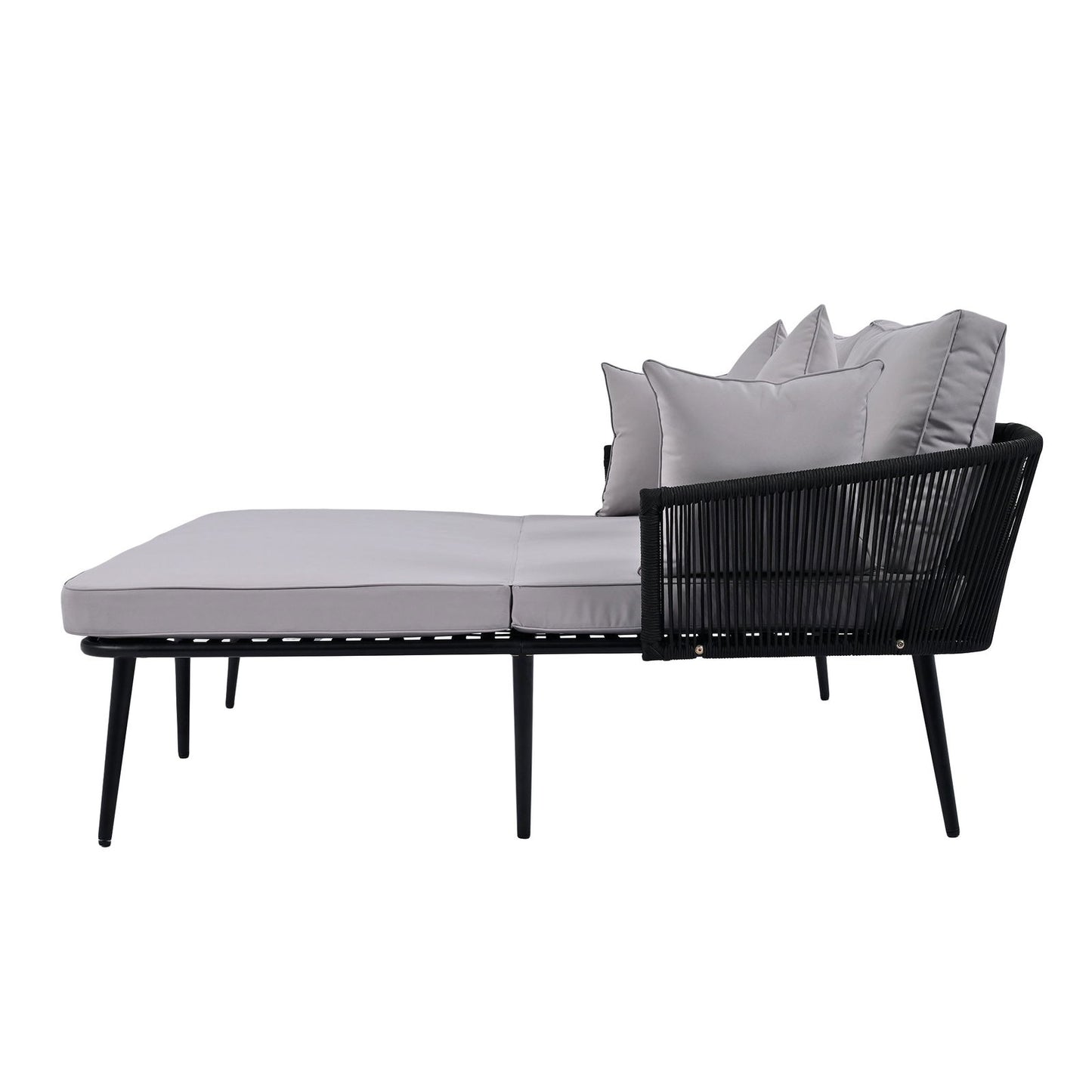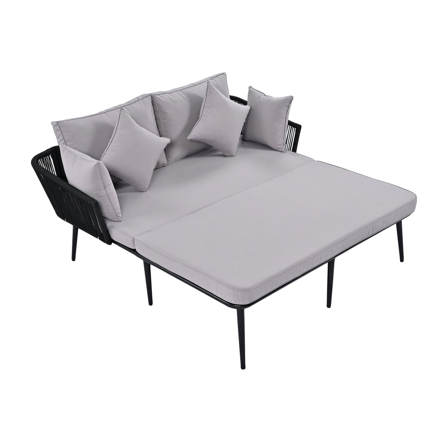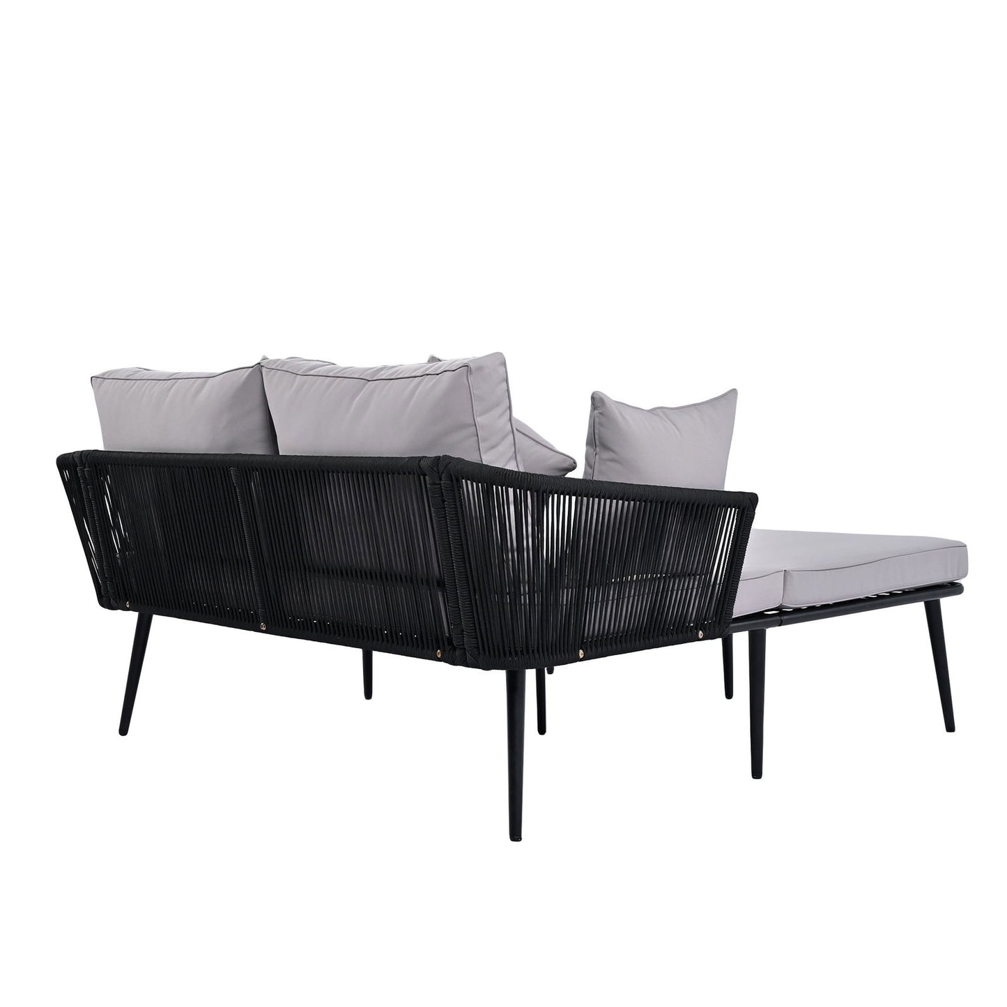 | Highlights | Outdoor patio daybed / Rope Backrest / 4 Upholstered Cushions / 3.5-inch thick cushions / All-Weather Cushion / Spacious Size / Iron frame with iron foot support / 2-Person Daybed |