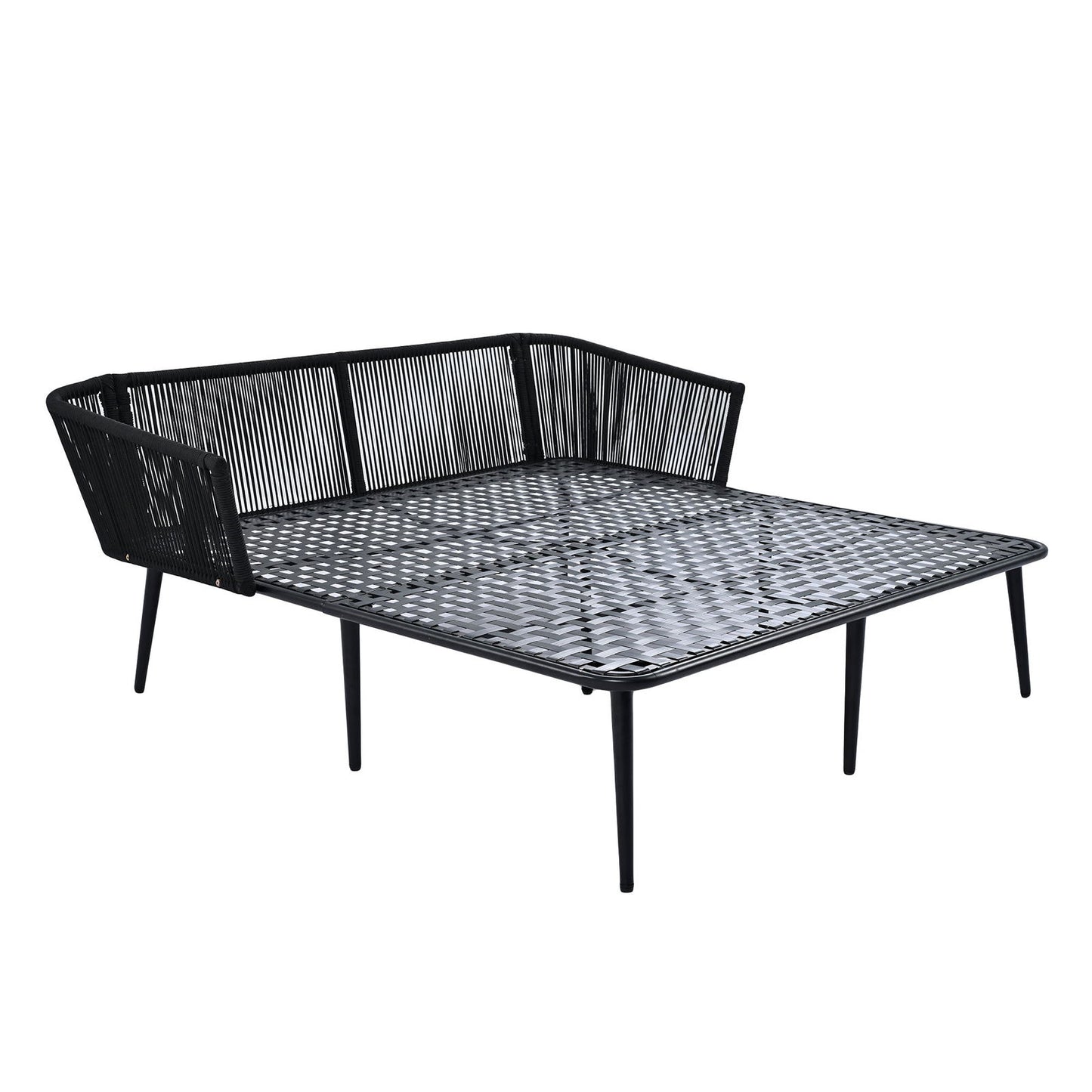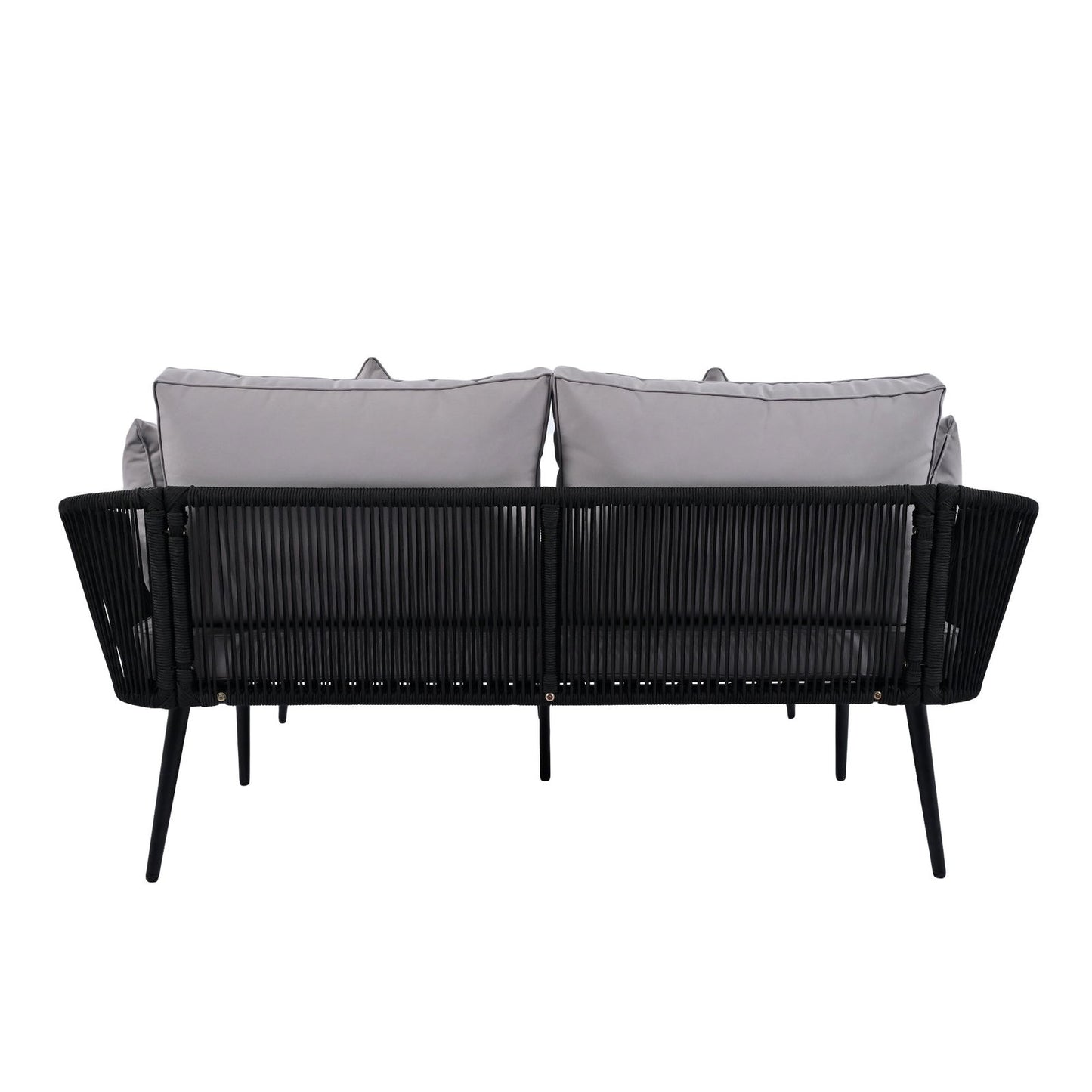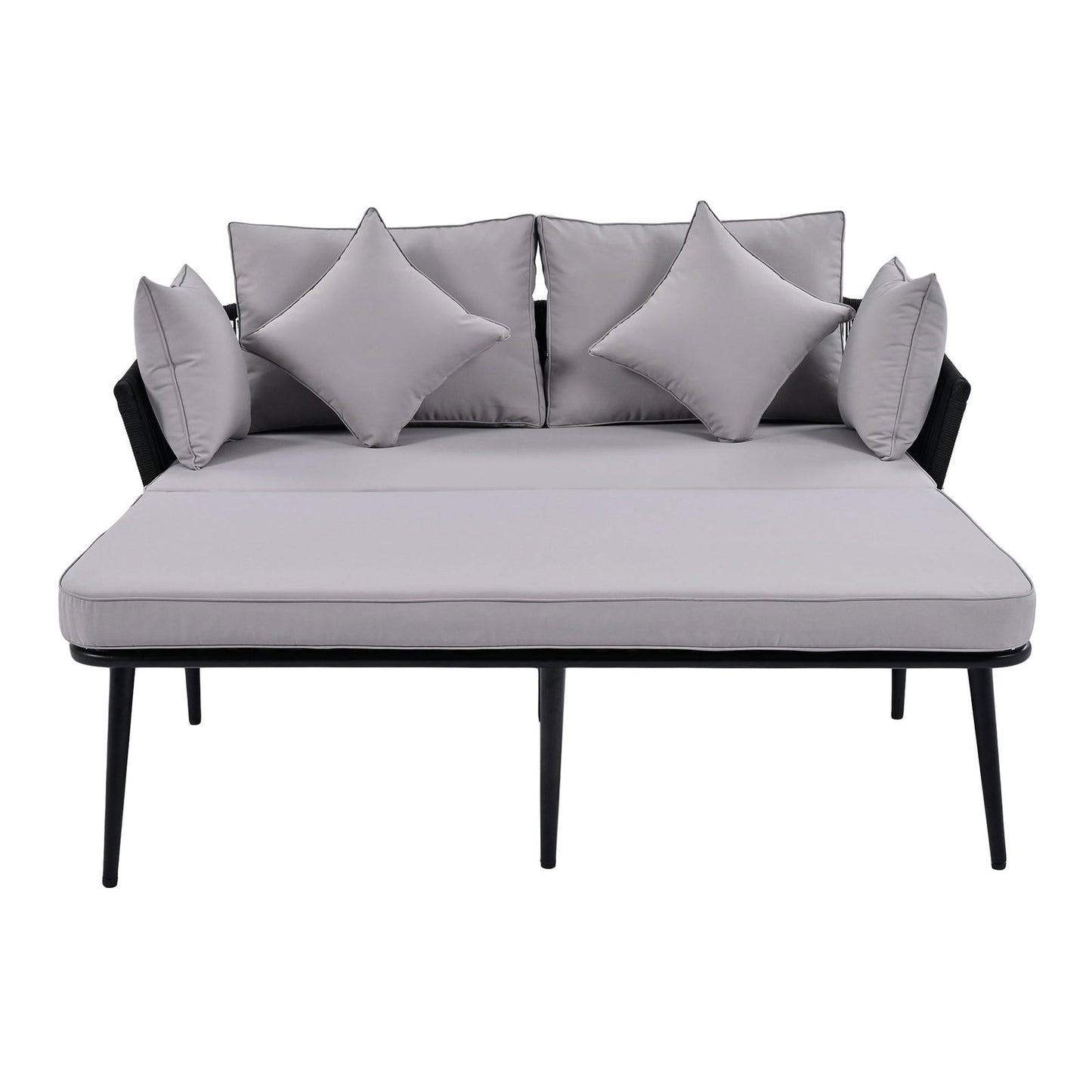 | Highlights | Outdoor patio daybed / Rope Backrest / 4 Upholstered Cushions / 3.5-inch thick cushions / All-Weather Cushion / Spacious Size / Iron frame with iron foot support / 2-Person Daybed |