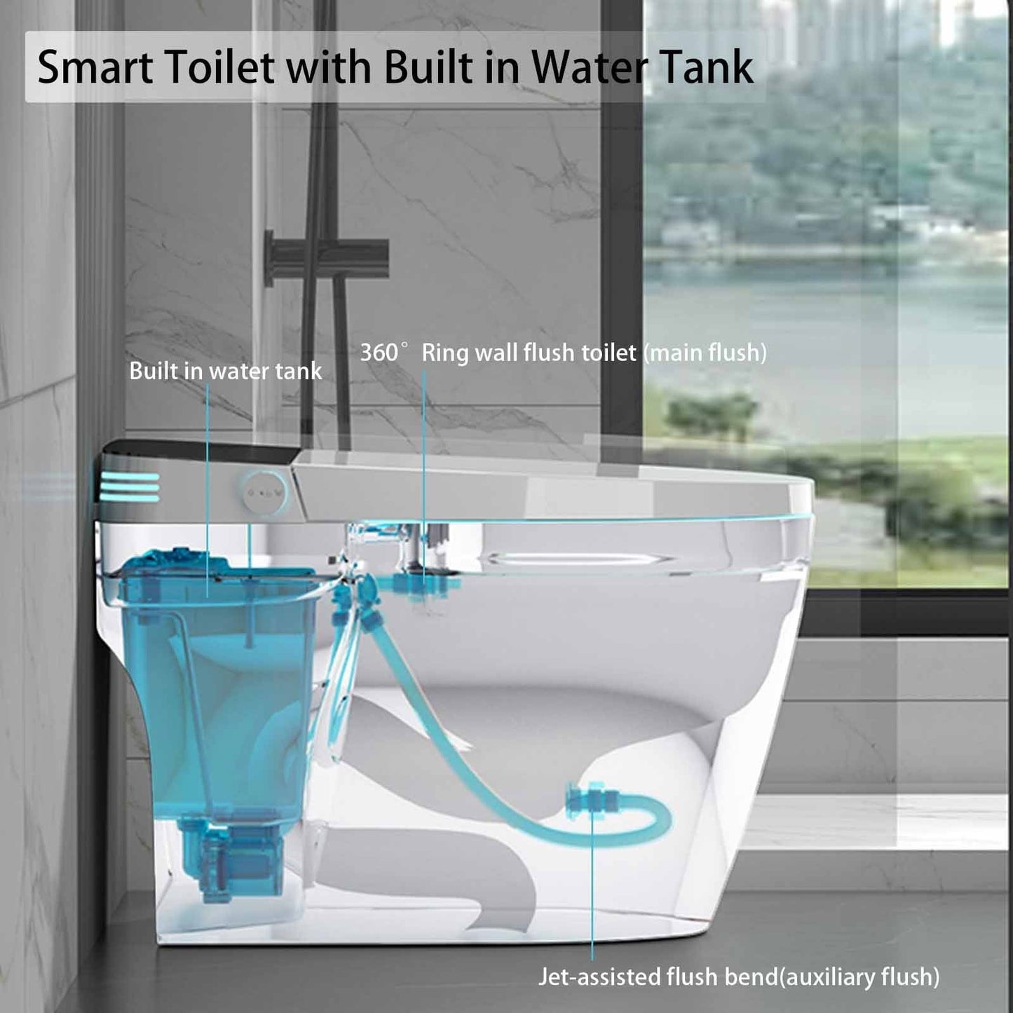 - [Smart Toilet without Water Pressure Limited]: Smart toilet with built in water tank suitable for any American house, featuring siphon jet flushing technology with powerful flushing in 1.28 GPF (flush rate: 1.28 gallon /per minute ), while flushing, siphon flushing will be started first, then followed by jet flushing. the smart toilet suitable for residential house with high water pressure to ensure flushing the bowl with water supply from the pipe directly.
