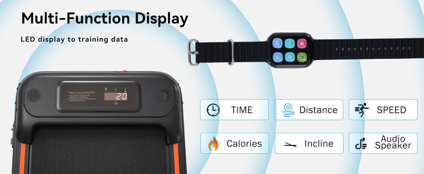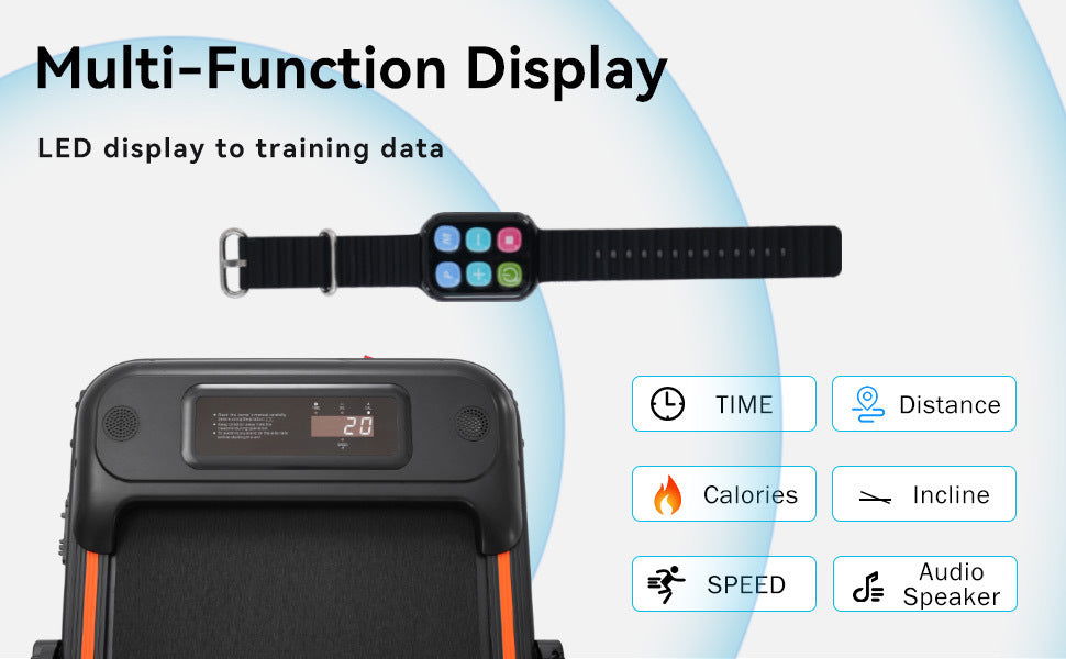 FITNESS TRACKING DISPLAY -- Our portable Treadmill is designed with a LED display to show speed, distance, time, and calories burned, allowing you to visualize your exercise and maintain motivation. You can control the speed or stop the treadmill by pressing the remote control.