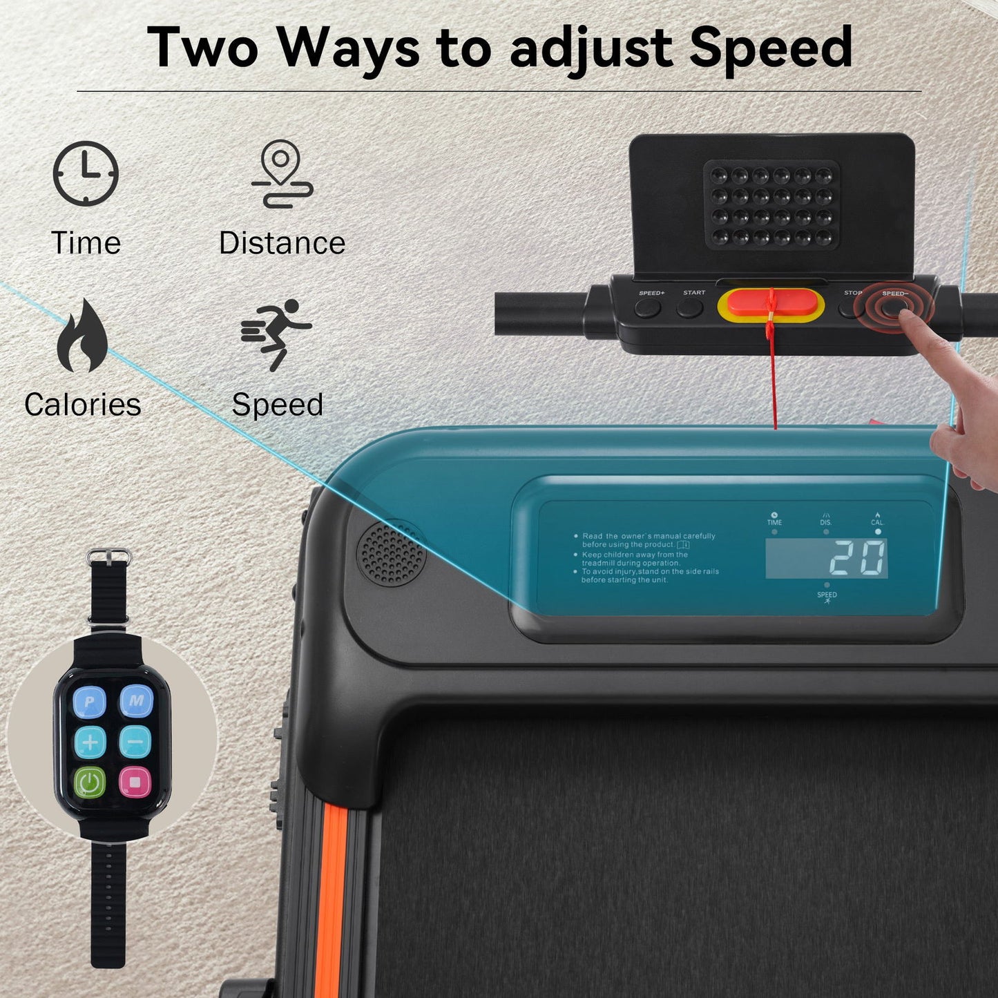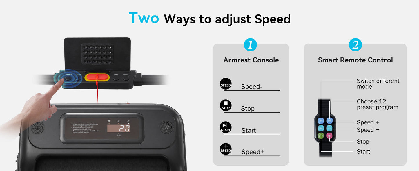 Via buttons on the armrest People can adjust Speed and stop the walking Pad