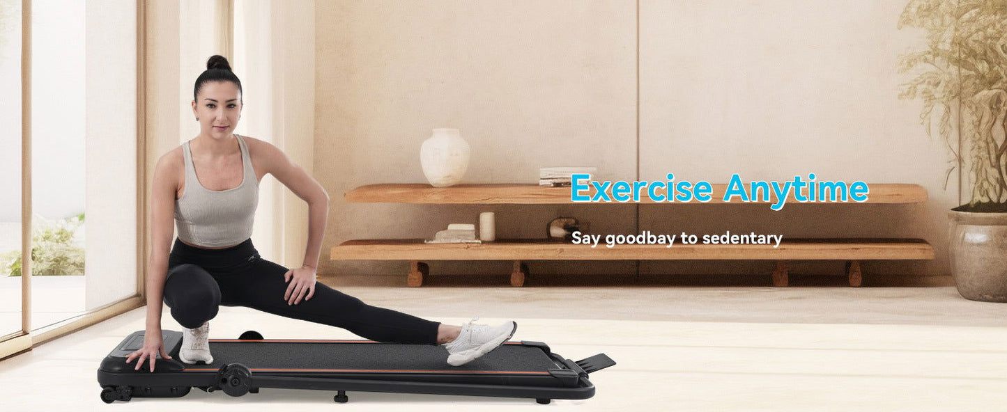 NO INSTALLATION -- No need to install, just take this walking pad out and use it. The dimension of the electric treadmill is 50.2"*24.8"*4.72". With transport wheels, you can easily move and store it under a sofa, bed, or behind a door, which greatly frees up some floor space.