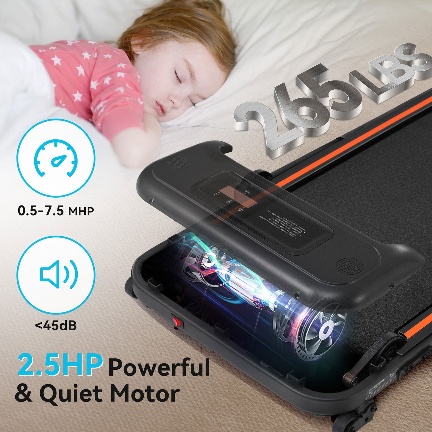 POWERFUL 2.5HP -- With a powerful and ultra-quiet 2.5HP motor and load a max weight capacity of 265lbs, this treadmill allows you to walk or run without disturbing others, making it ideal for home and office use. With a sturdy and durable steel frame and multi-layer shield design, it's shock-absorbing and noise-reducing, making your running quieter, safer and more comfortable.