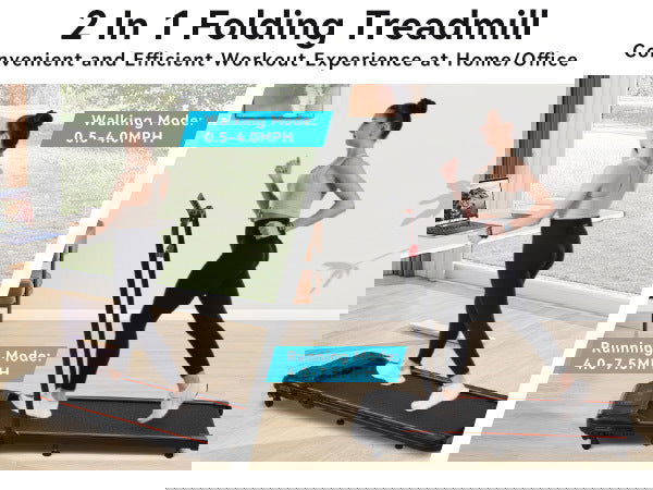 INNOVATIVE 2-IN-1 FOLDING TREADMILL -- Compared to ordinary treadmills, our 2-in-1 treadmill has 2 modes to meet your different sports needs. When the riser is folded, it can be used as a jogging machine at a speed of 0.5MPH-4MPH, when the handrail is raised, the running speed is 4MPH-7.5MPH.