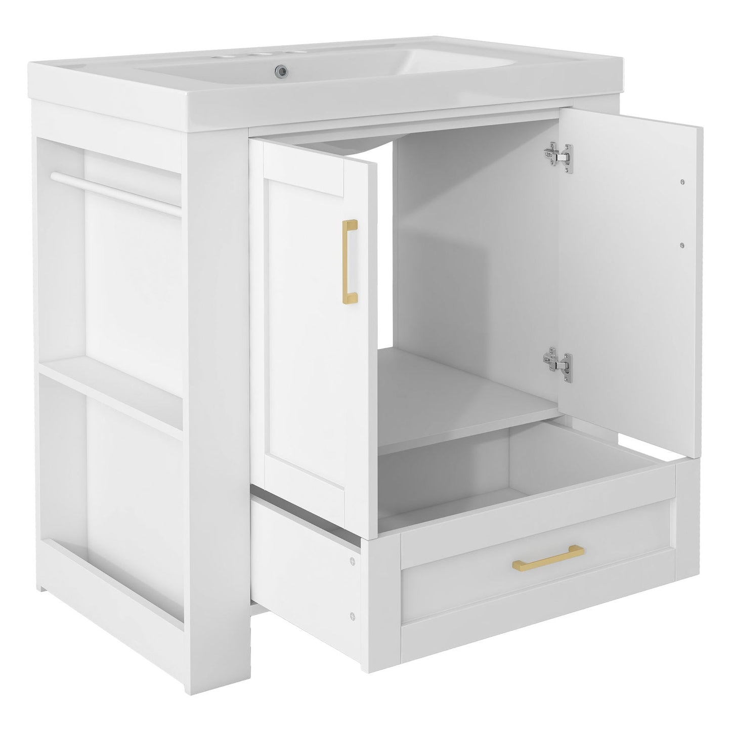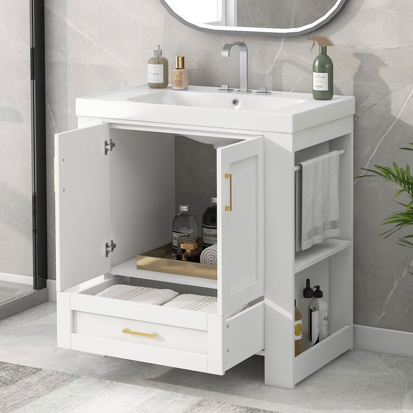 - In order to meet your diverse storage and storage needs. We have configured this bathroom cabinet with a closed storage cabinet and a large-capacity storage drawer. In addition, in order to achieve a more reasonable space utilization, we also designed two layers of storage partitions and towel hanging rods on both sides of the cabinet.