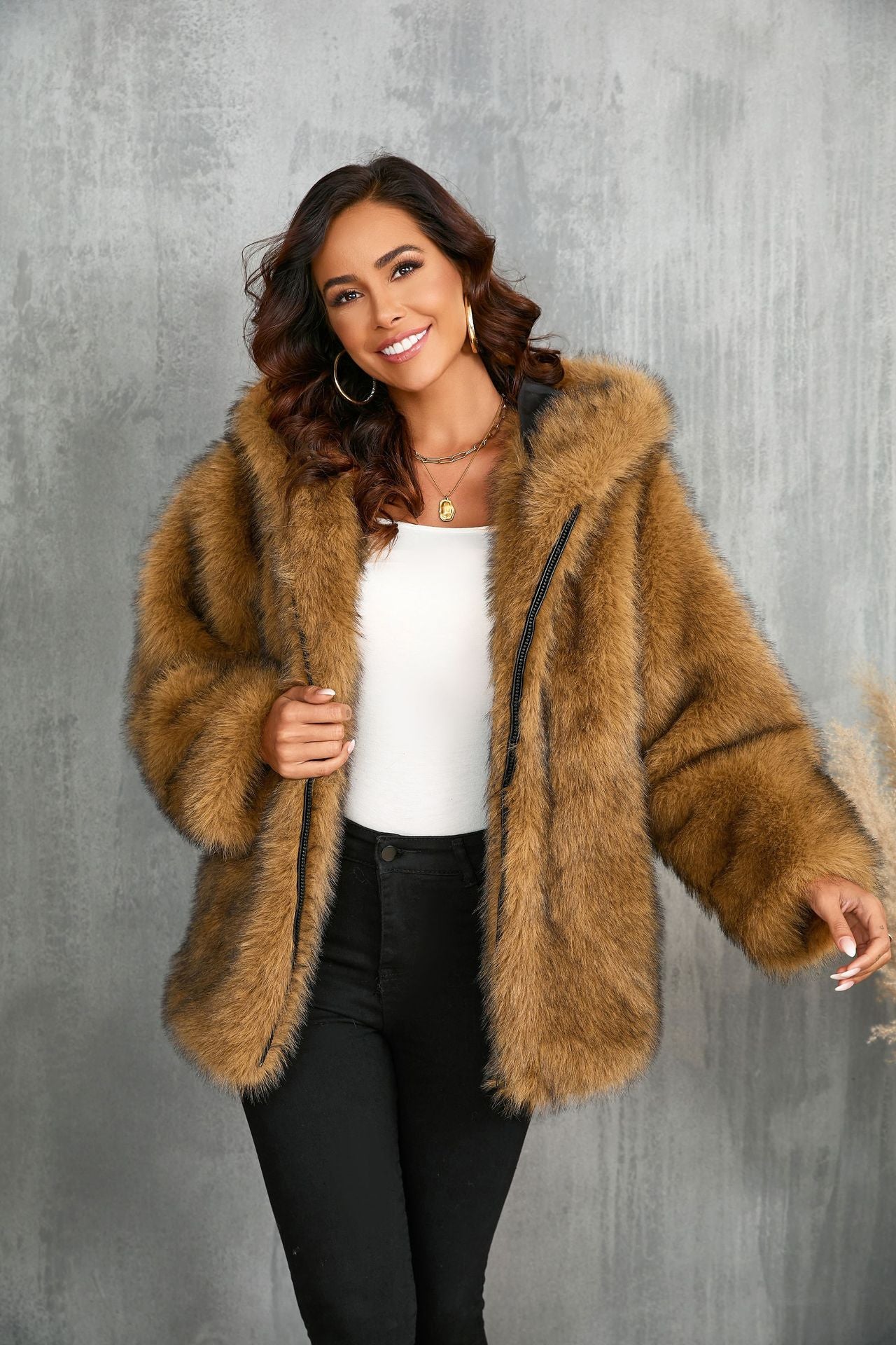 Faux Fur Coat Solid Color Loose Hooded Short Fur Collar Coat Winter Coat Warm Winter Clothing