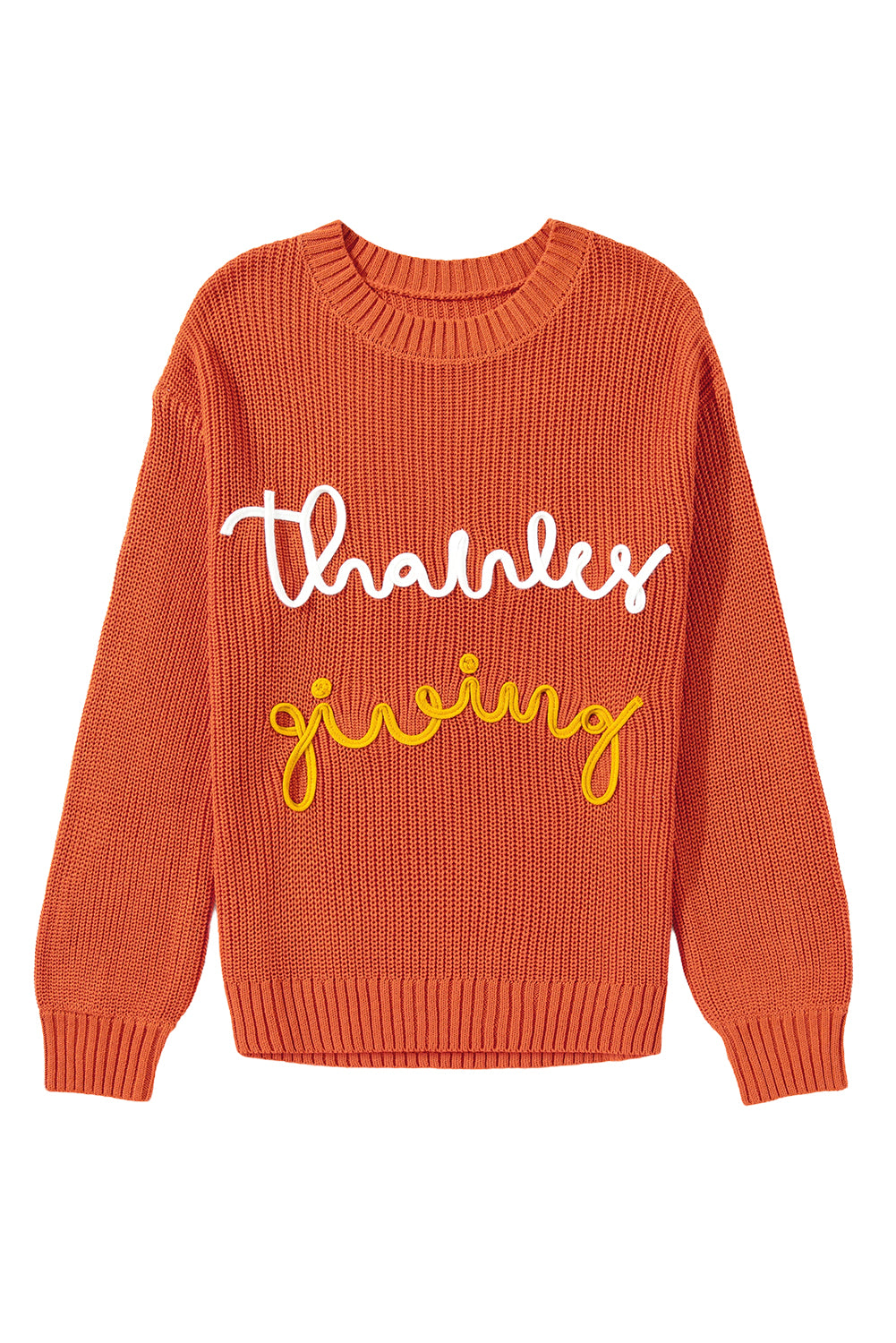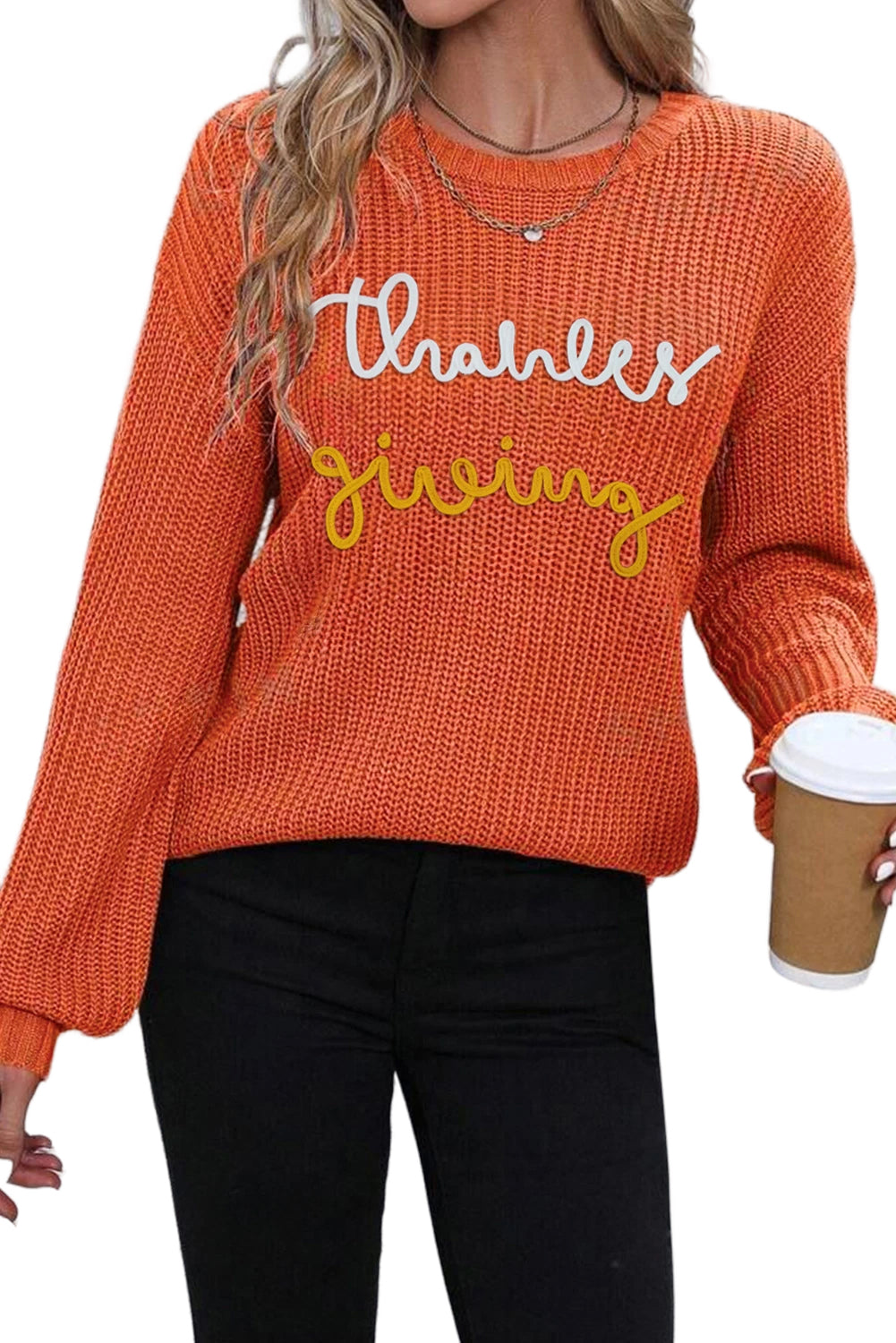Gold Flame Thanksgiving Letter Graphic Crew Neck Sweater