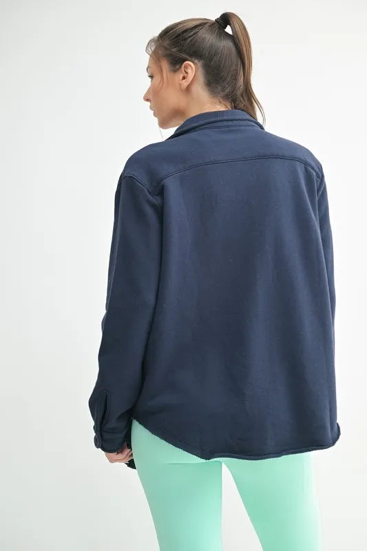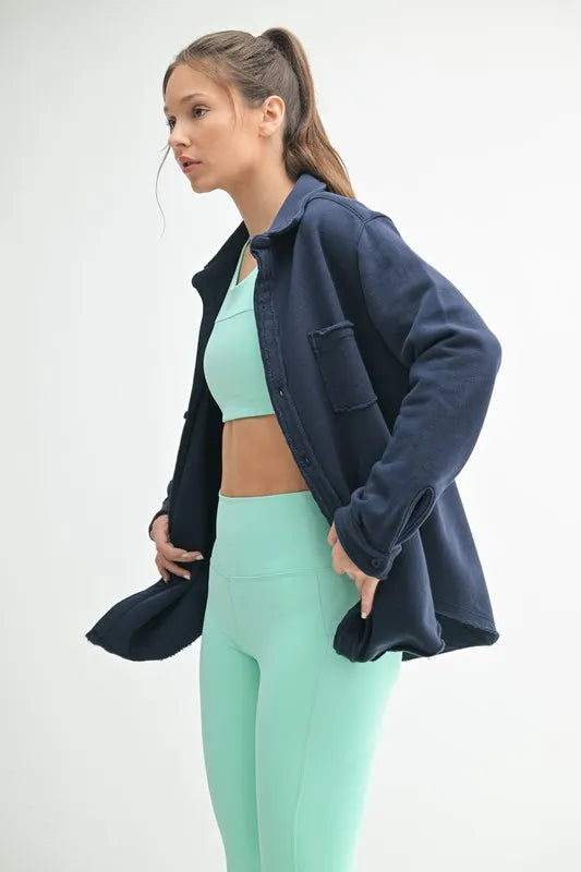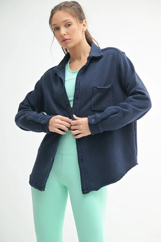 The Raw Edge Cotton Button Down Shacket is a versatile and on-trend piece that combines the style of a shirt with the comfort of a jacket. The raw edge detailing adds a casual and edgy touch to the garment. With its button-down front, this shacket can be worn open as a layering piece or buttoned up as a standalone top. Made from soft cotton, it offers both warmth and breathability. Perfect for adding an effortless and stylish layer to your outfit, the Raw Edge Cotton Button Down Shacket is a must-have for a chic and functional wardrobe.