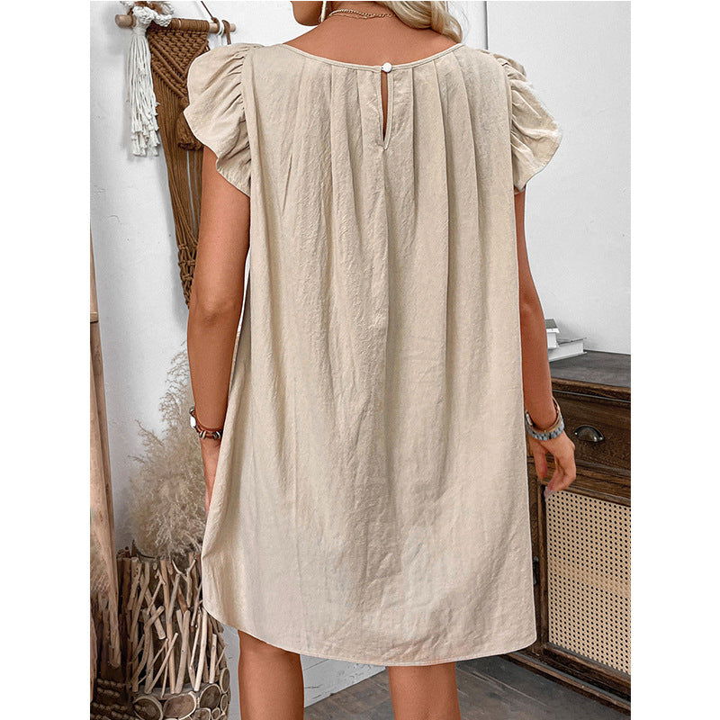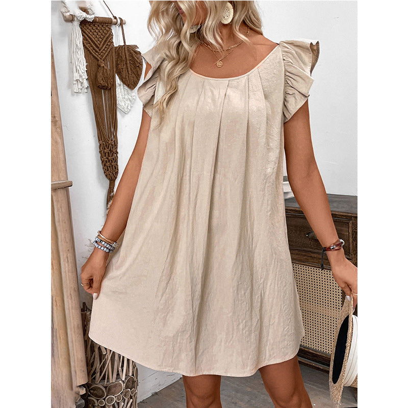 Round Neck Dress Solid Color Mid Dress Summer Ruffles Solid Color Round Neck Loose Mid Dress Women