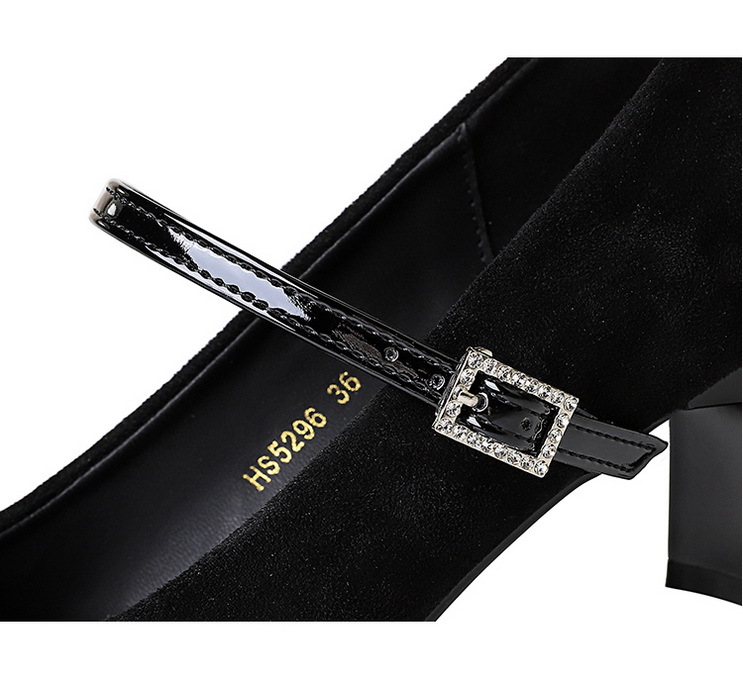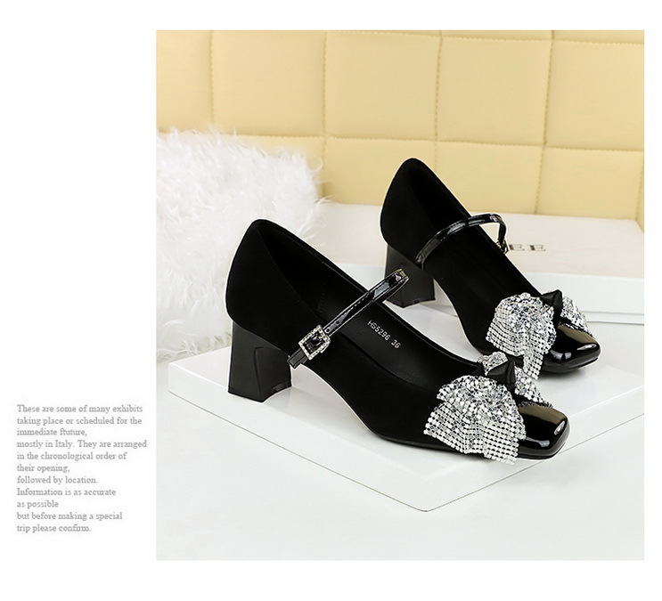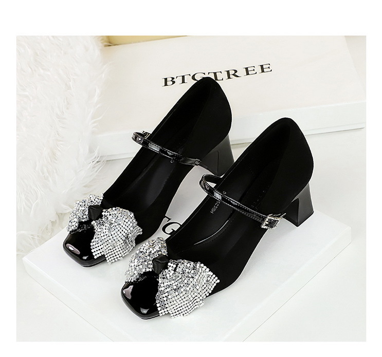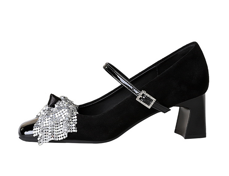 Strap Rhinestone Buckle Mary Jane Shoes Square Toe Chunky Heel Sequined Bow Women Mid Heel Shoes