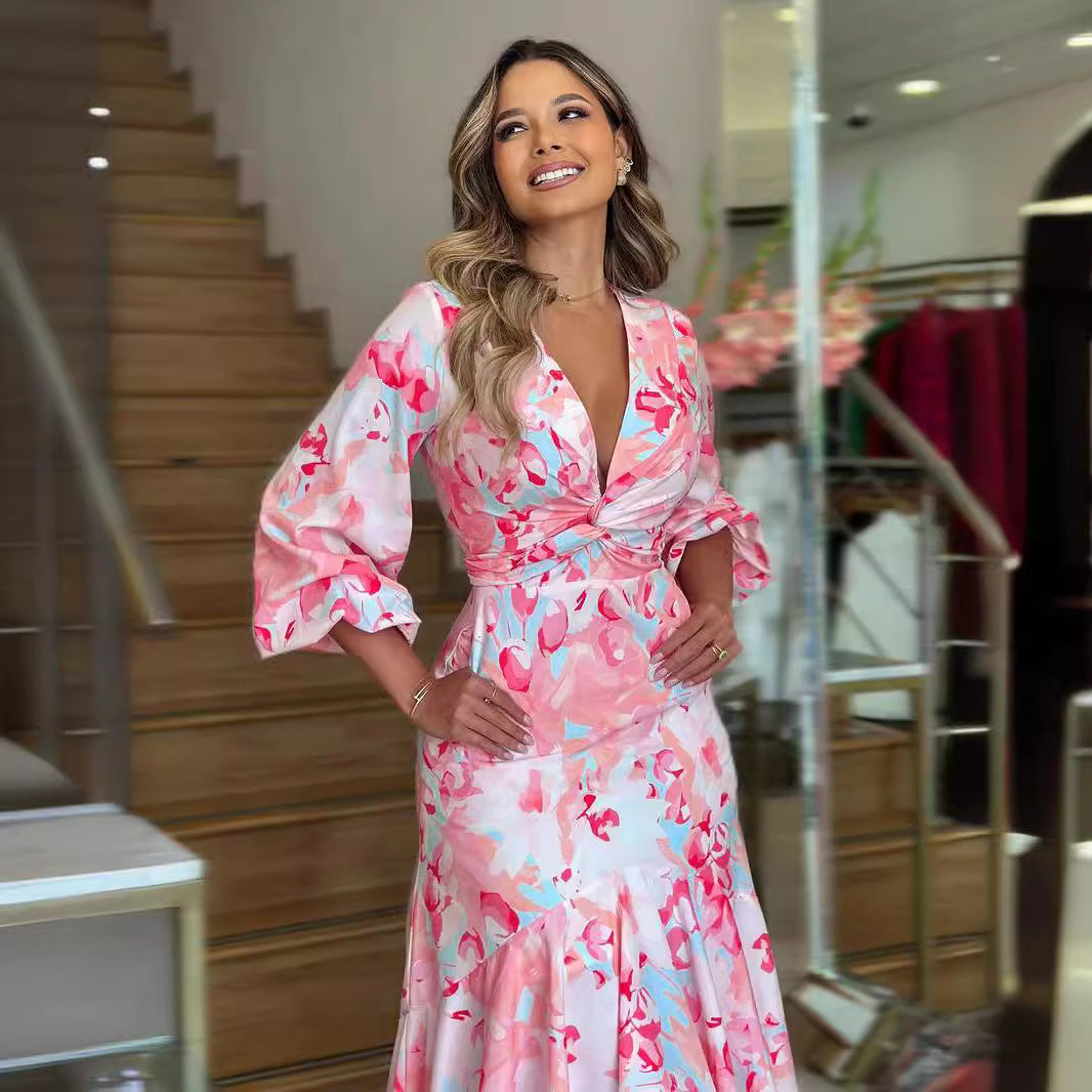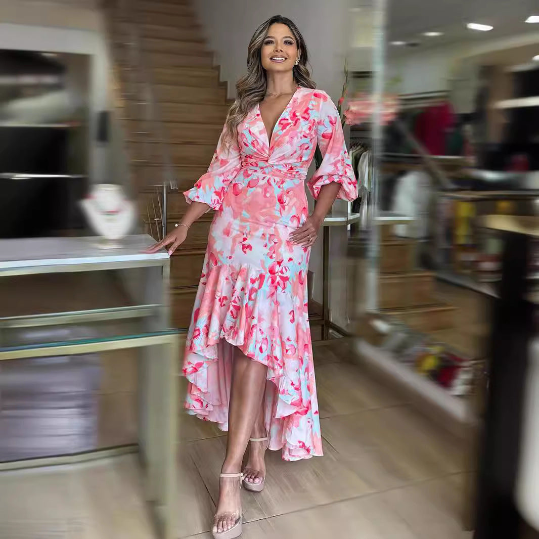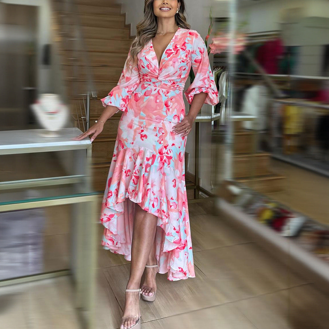 Women Clothing V neck Slimming Slim Fit Maxi Dress Bubble Long Sleeve Irregular Asymmetric Ruffles Dress